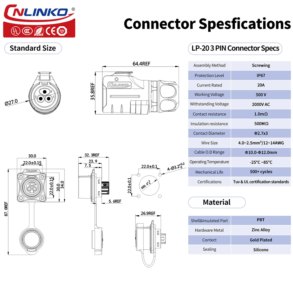 Le connecteur d’alimentation AC/DC à verrouillage rapide LP20 de CNLINKO est un connecteur étanche conçu pour les applications dans l’industrie automobile. Il est doté d’une conception multicœur pour s’adapter à différents besoins industriels. La prise en métal d’alliage offre une protection électromagnétique complète et une excellente résistance aux interférences radiofréquences.