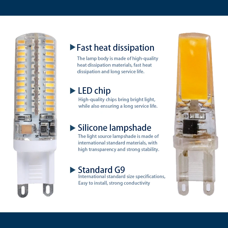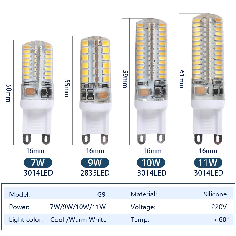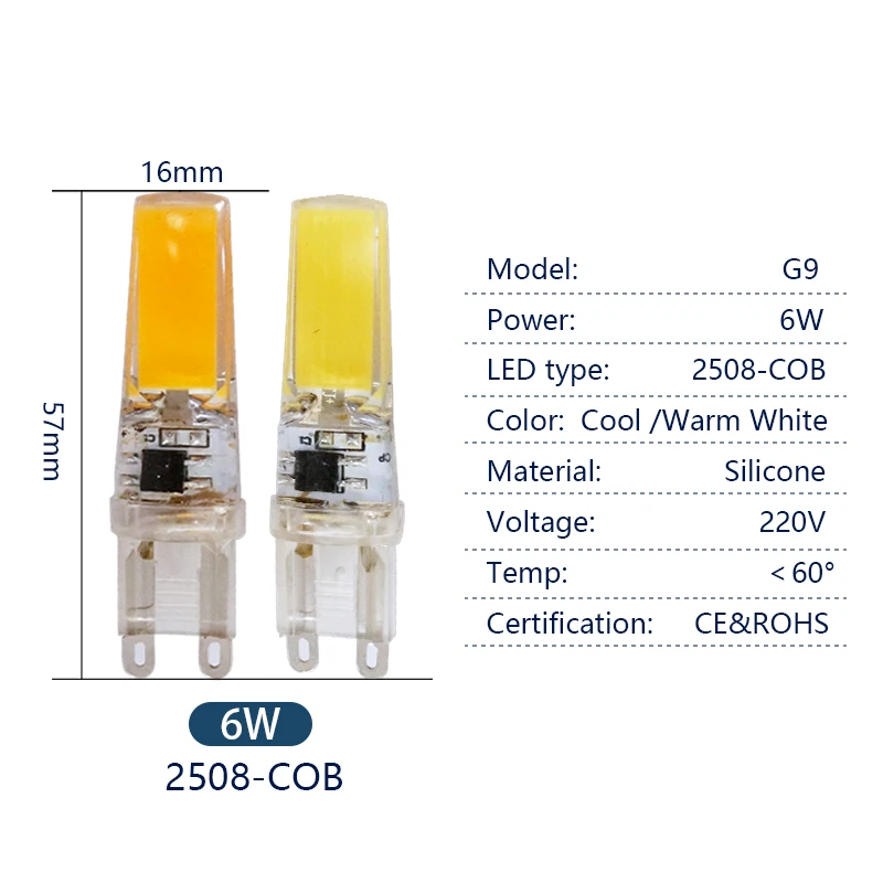 | 6 pcs/lot LED G9 Lampe AC220V 6W 7W 9W 10W 11W Led ampoule SMD 2835 3014 2508 LED G9 lumière Remplacer 20W/30W/40W/50W lampe halogène | 6W/7W/9W/10W/11W | AC 220V | 48/64/96/104 pièces COB | G9 | 360 | Gel de silice | SMD 2835/3014/2508 | Blanc chaud/Blanc froid | 2700-3500K/5500K-6500K |