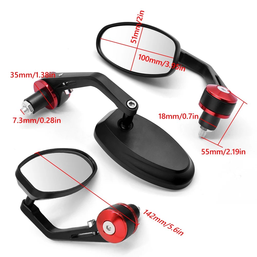 Les rétroviseurs ont une taille de 10cm x 5.5cm (3.9″ x 2.16″) pour les miroirs et une longueur de tige de 13cm (5.11″).