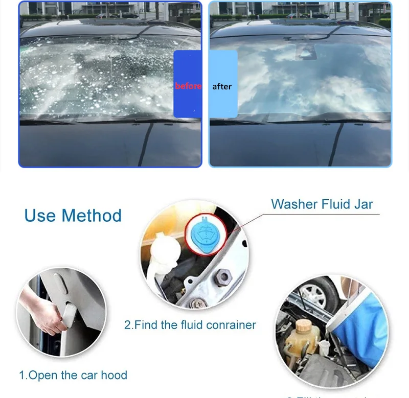 Ce produit convient aux températures supérieures à zéro degré Celsius. Son utilisation est simple : ouvrez le capot de la voiture, trouvez l’essuie-glace, ajoutez un morceau de nettoyant effervescent (si le verre est très sale, il est recommandé d’ajouter 2 morceaux), attendez 5 minutes, puis utilisez-le normalement. Un morceau d’eau conventionnelle peut être échangé avec 4L d’eau. Selon le volume normal des réservoirs de stockage de liquide, un morceau d’eau peut remplacer et être supérieur à l’eau de verre traditionnelle.