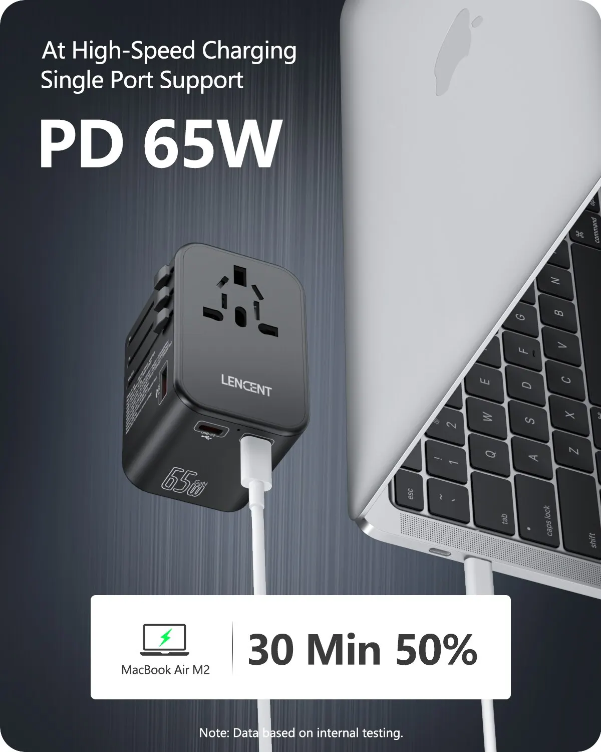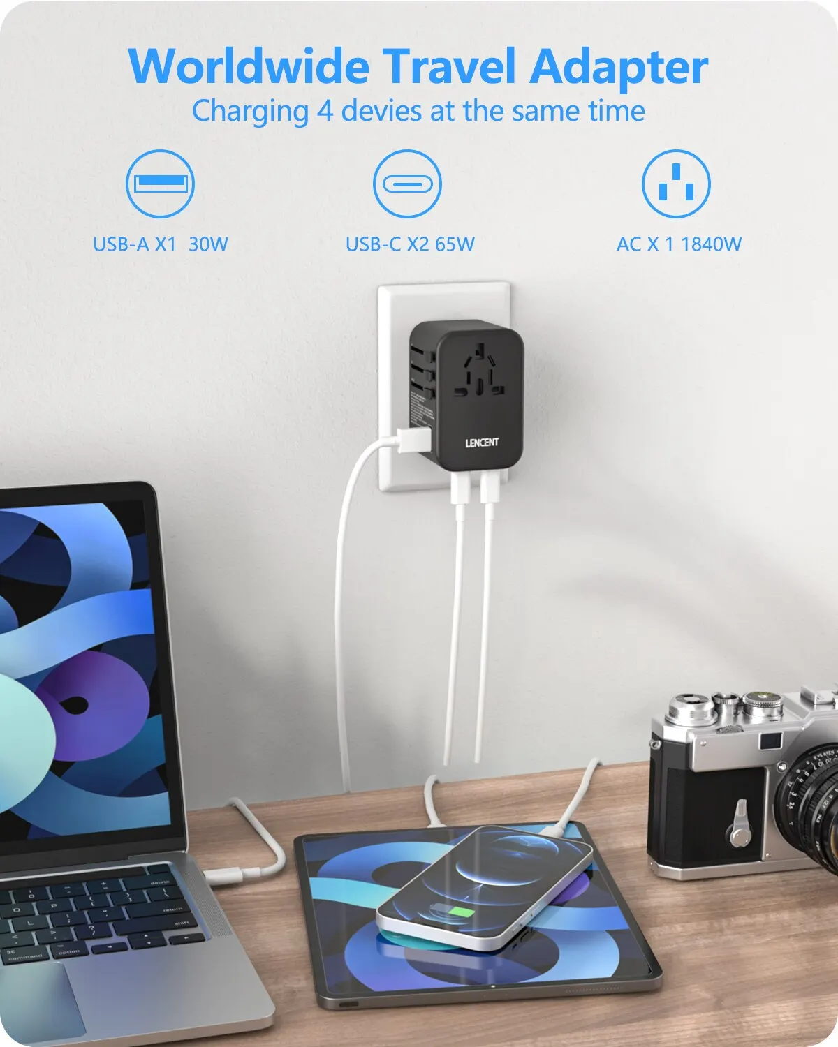 L’adaptateur de voyage LENCENT avec 1 ports USB (30W Max) et 2 ports de type C (65W Max) est capable d’identifier intelligemment les appareils connectés et de détecter et de fournir un courant de charge optimal, assurant une charge rapide et sûre.