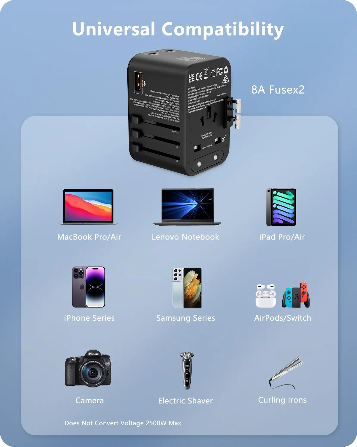 La technologie GaN Pro rend notre dernier adaptateur de voyage plus petit sans une baisse de puissance, et offre une meilleure expérience de charge rapide à basse température. Equipé d’un double fusible 8A intégré pour la protection contre les surcharges et la soupape de sécurité, il protégera les personnes contre les blessures si elles touchent directement des pièces sous tension sur la prise.