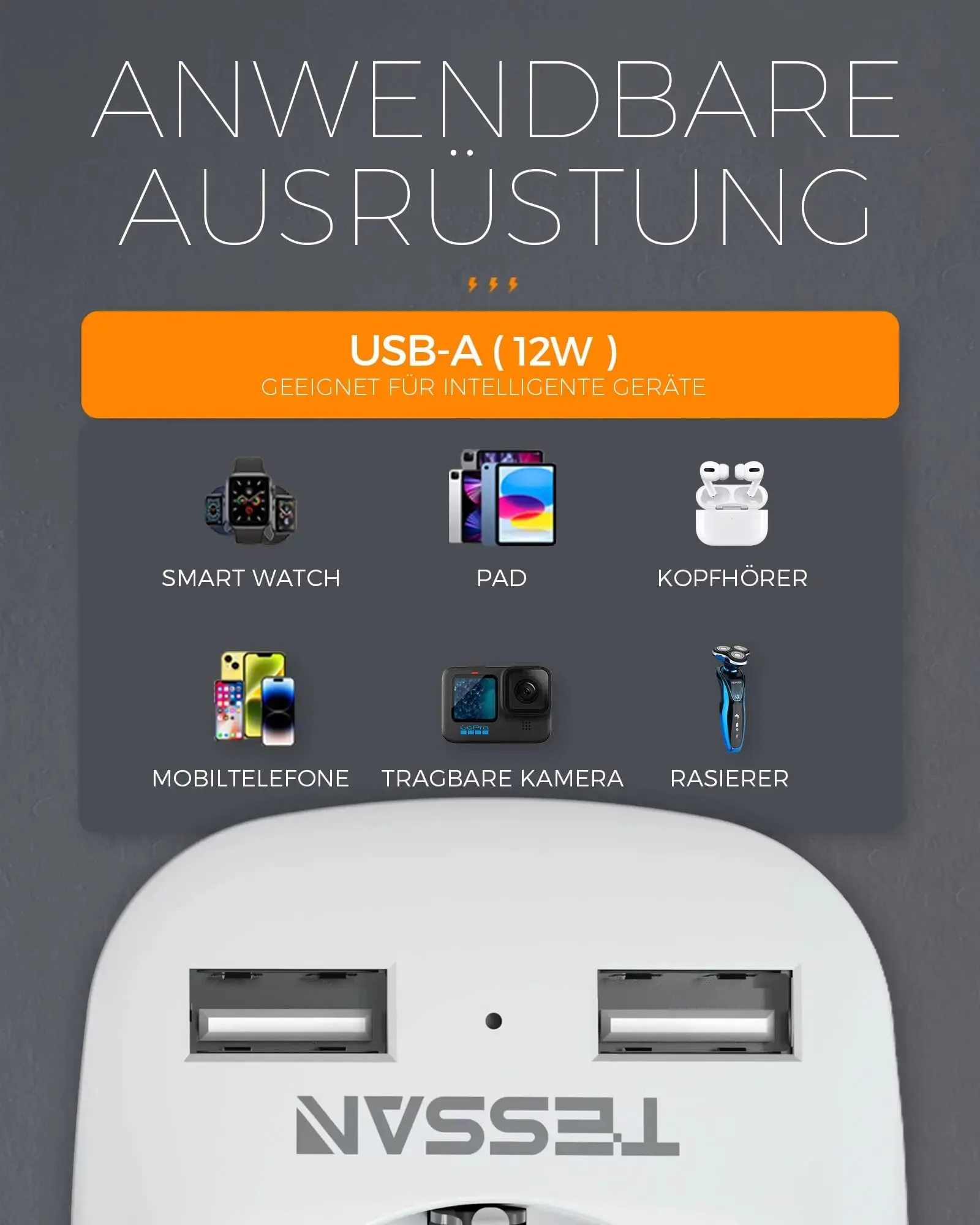 L’adaptateur de voyage TESSAN est un adaptateur 3 en 1 vous permettant de connecter des appareils avec des fiches de sécurité allemandes, des contours et des fiches européennes à une prise USA (type B). Sa puissance maximale est de 1250 watts (max. 125 V, 10 A) et il dispose de deux ports USB pouvant charger jusqu’à 2,4 A. Il est idéal pour charger des produits électroniques tels que les téléphones portables et les tablettes.