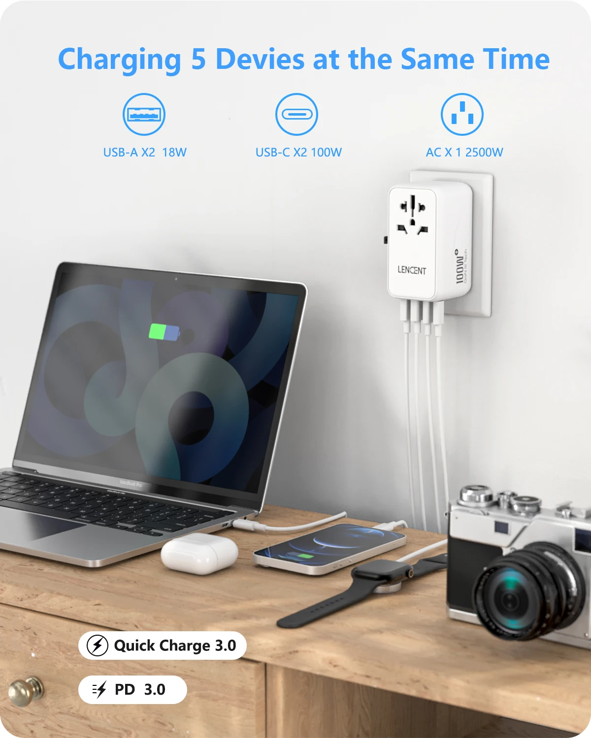 Cet adaptateur de voyage LENCENT est doté de 2 ports USB et 3 ports de type C qui sont capables d’identifier intelligemment les appareils connectés et de fournir un courant de charge optimal, garantissant ainsi une charge rapide et sécurisée.
