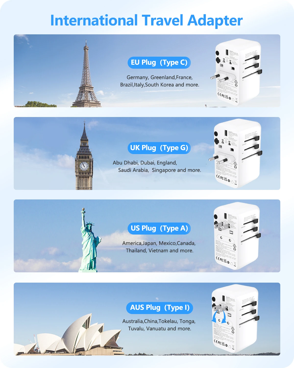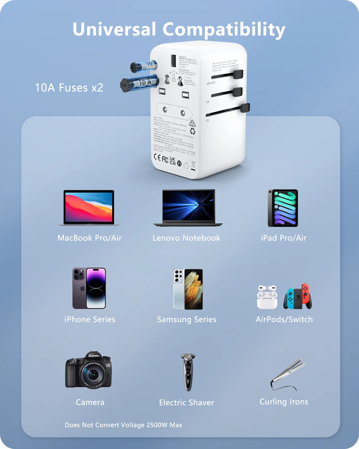 Cet adaptateur de voyage est approuvé par les normes FCC, CE et ROHS, garantissant ainsi sa sécurité d’utilisation. Il est équipé d’un double fusible intégré de 10A pour protéger contre les surcharges et d’une soupape de sécurité pour éviter les blessures en cas de contact direct avec les parties sous tension de la prise.