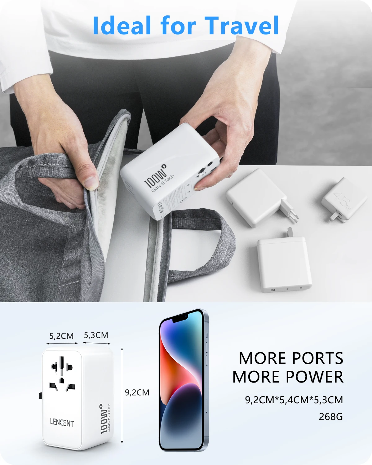 L’adaptateur de voyage universel 5-en-1 LENCENT est conçu pour être utilisé dans plus de 200 pays. Il accepte les prises des spécifications suivantes : Type B / Type E / Type F / Type G / Type I. Cet adaptateur compact et léger de 10A dispose d’1 prise AC, 2 ports USB (18W) et 2 ports de type C (100W), ce qui permet de charger jusqu’à 5 appareils simultanément. Grâce à sa taille portable (8.3x8x6.3cm) et son poids léger, il est très pratique pour les voyages.