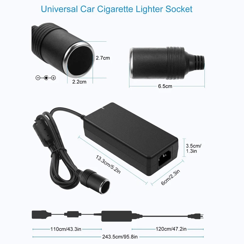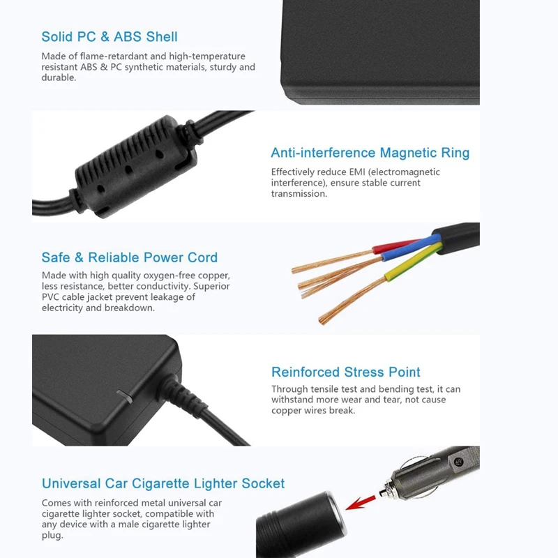 - Exemples d’appareils compatibles : réfrigérateur de voiture, télévision de voiture, nettoyeur de voiture, caméra de tableau de bord de voiture, enregistreur vidéo DVR de voiture, émetteur FM Bluetooth de voiture, purificateur d’air de voiture, humidificateur de voiture, coussin de massage de voiture, ventilateur d’air de voiture, etc.