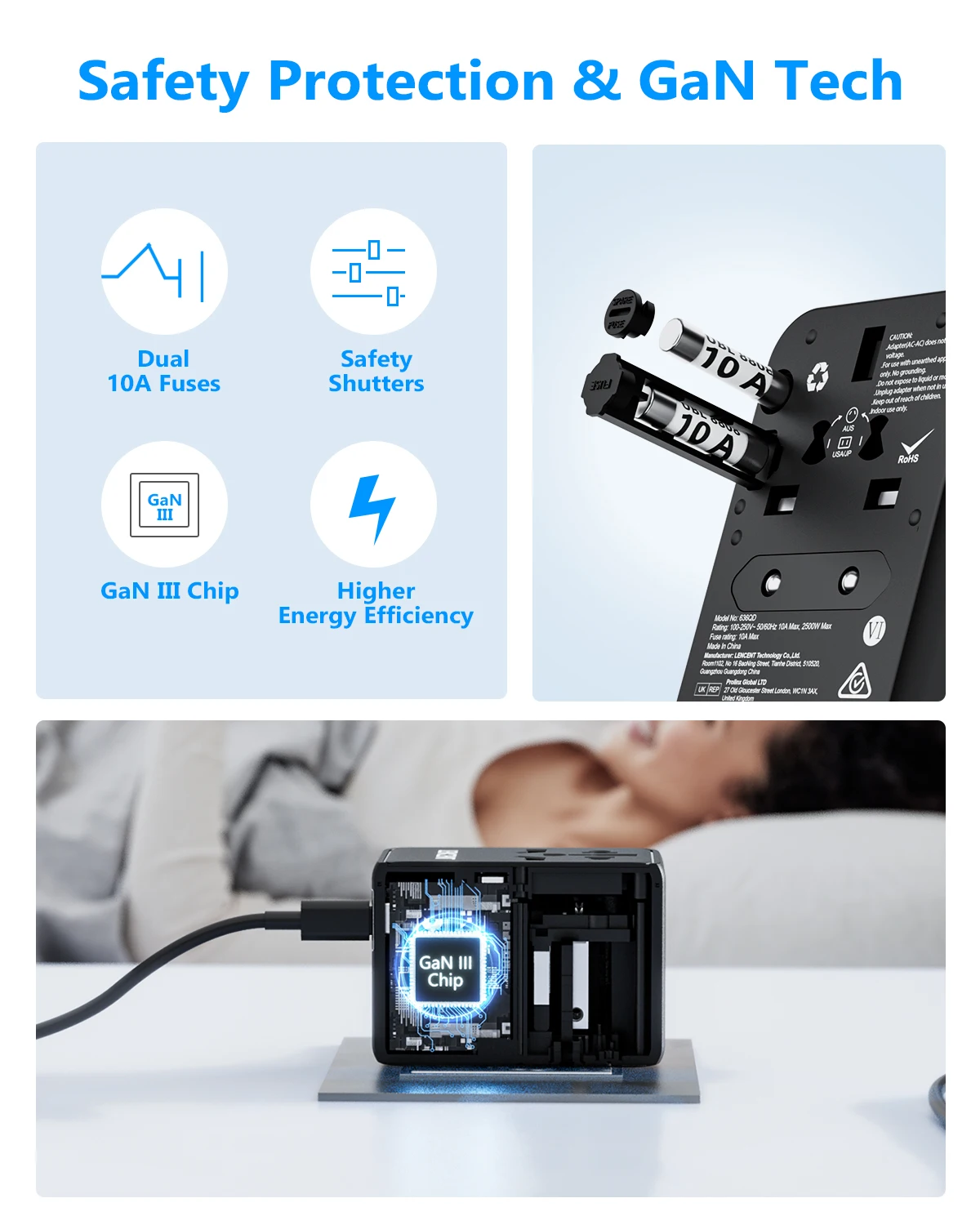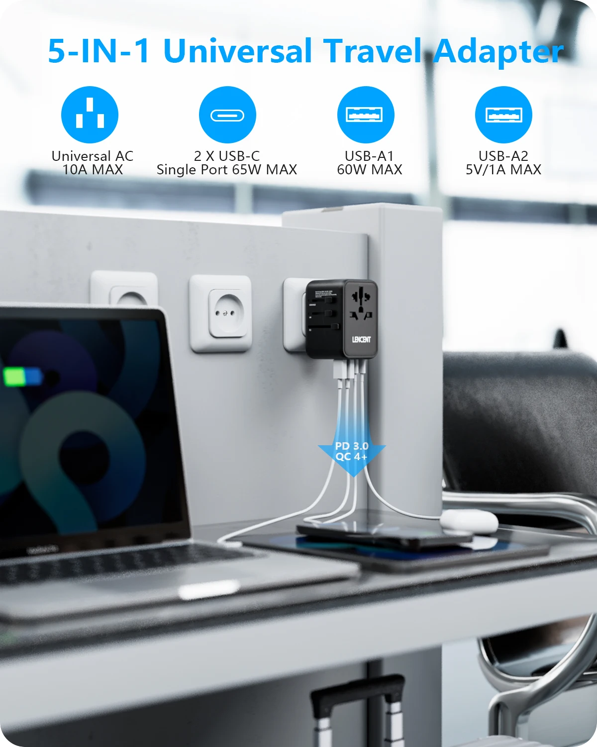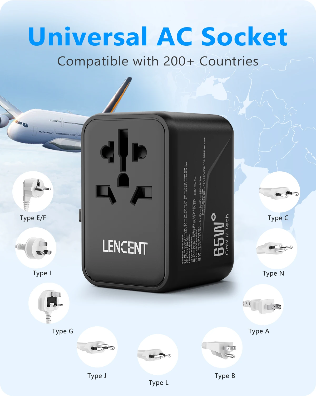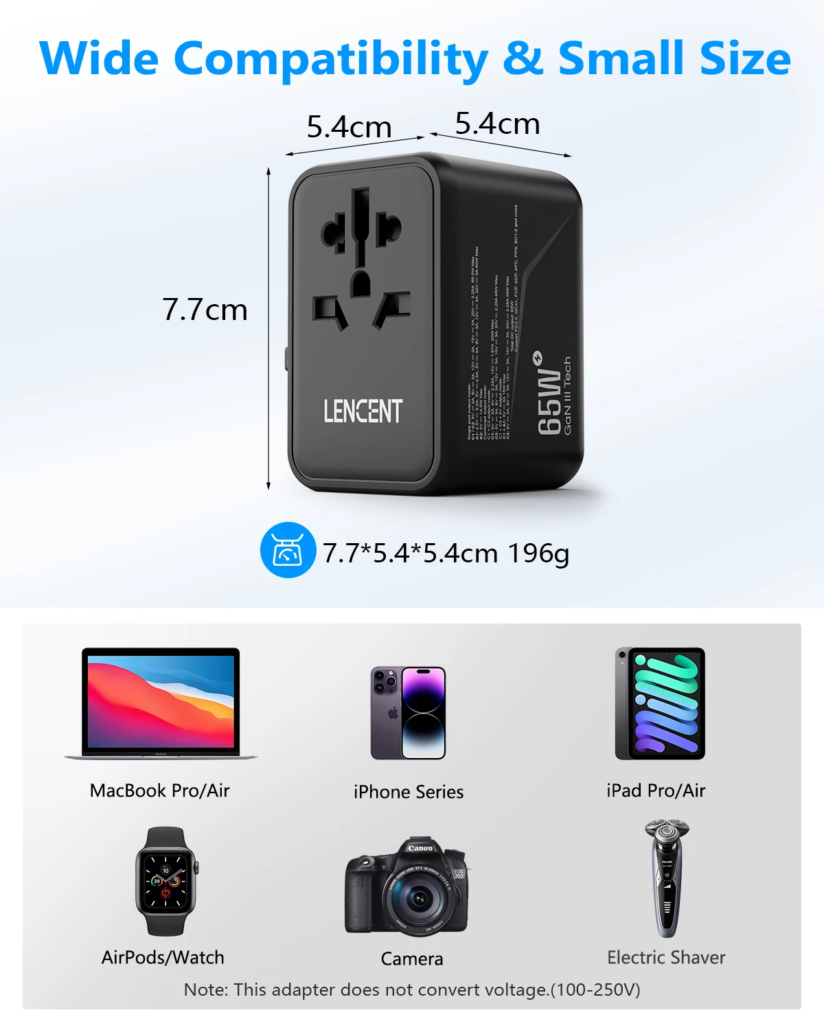 L’adaptateur de voyage universel 5-en-1 de LENCENT peut être utilisé dans plus de 200 pays, tels que l’Australie, le Canada, la Chine, l’Europe, le Japon, le Royaume-Uni, les États-Unis et la Nouvelle-Zélande. Il accepte les prises des spécifications suivantes: Type B / Type E / Type F / Type G / Type I. Cet adaptateur compact et léger de 10A est équipé d’une prise CA, de 2 ports USB et de 2 ports de type C, permettant de charger 6 appareils à la fois. Il utilise la technologie de charge rapide GaN 65W pour une charge rapide des ordinateurs portables, tablettes, téléphones portables, etc. L’adaptateur est approuvé par la FCC, la CE et la ROHS, garantissant une sécurité optimale. Il dispose également de la technologie AUTO-ID pour une charge intelligente. C’est un choix idéal pour les voyages, compact et polyvalent. Notez qu’il ne convertit pas la tension.