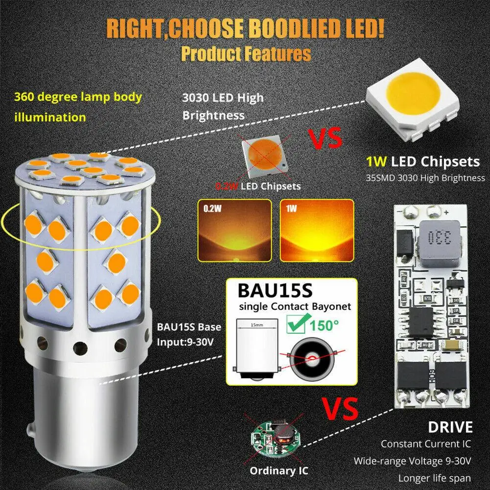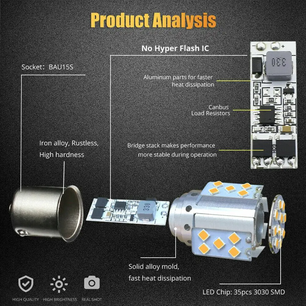 Les Ampoules de Clignotant LED Ambre 15s 7507 PY21W sont conçues spécialement pour les clignotants avant ou arrière uniquement. Elles ne clignotent pas excessivement, donc aucun besoin de résistances de charge. Alimentées par 35 puces LED SMD de 1W chacune, ces ampoules offrent une lueur ambrée extrêmement brillante. Elles sont environ 3x plus lumineuses et plus efficaces que les ampoules à incandescence d’origine, ce qui en fait un choix parfait pour une mise à niveau des clignotants. Le design révolutionnaire de ces ampoules permet de les convertir facilement sans problème d’hyper clignotement. L’installation est plug and play, aucune modification n’est nécessaire.