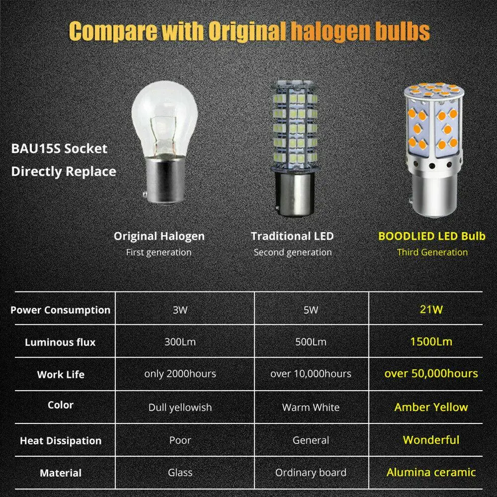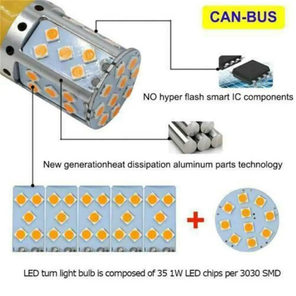 Les ampoules ont une luminosité de 1500 LM chacune et sont compatibles avec une tension de 9-30V. Elles consomment 21W par ampoule et ont une taille standard. La couleur de la lumière est ambrée. Veuillez noter que ces ampoules ne peuvent être utilisées que pour un clignotant de type Amber-Off-Amber-Off. Elles ne peuvent pas être utilisées pour l’éclairage constant comme les feux de route ou les feux de jour. De plus, bien qu’elles ne clignotent pas excessivement, elles ne sont pas « sans erreur » pour les voitures européennes.