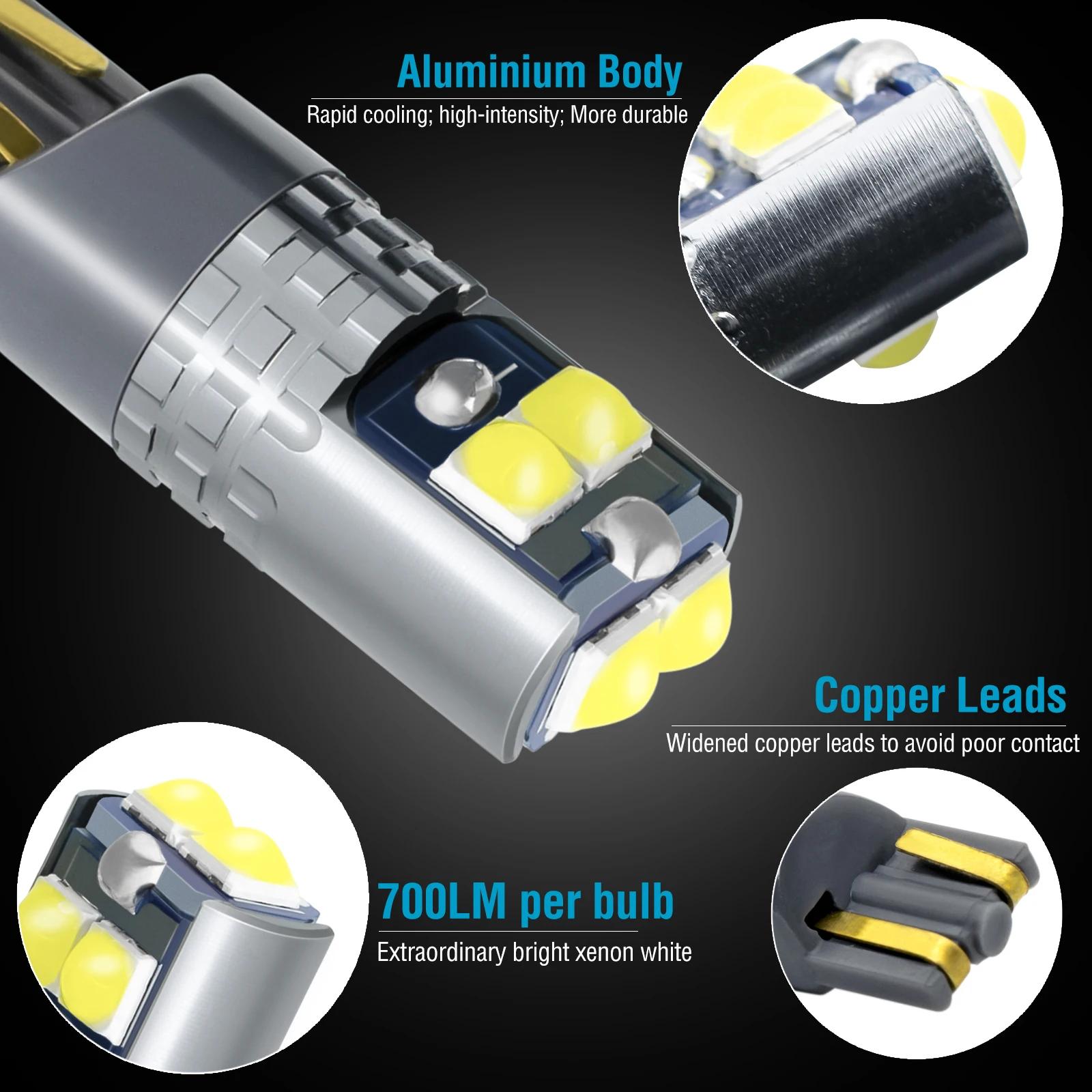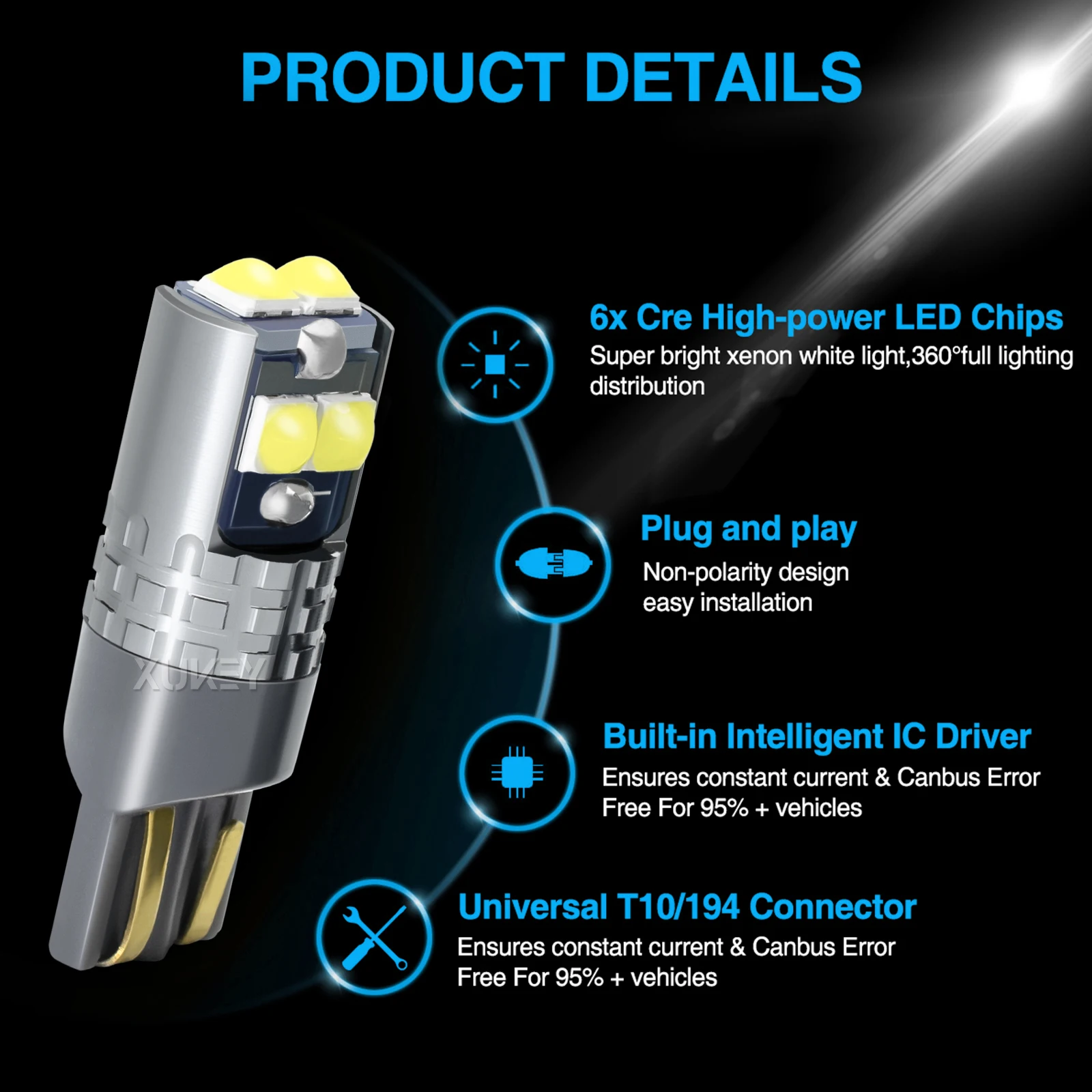 | Caractéristiques | Excellent rendement lumineux, 6x jeu de puces SMD haute puissance super lumineux, diffèrent des ampoules halogènes jaunâtres d’origine. Performances parfaites, ampoules LED T10 CANBUS sans erreur pour feux de position latéraux/ultra lumineux/blanc xénon 6000K |