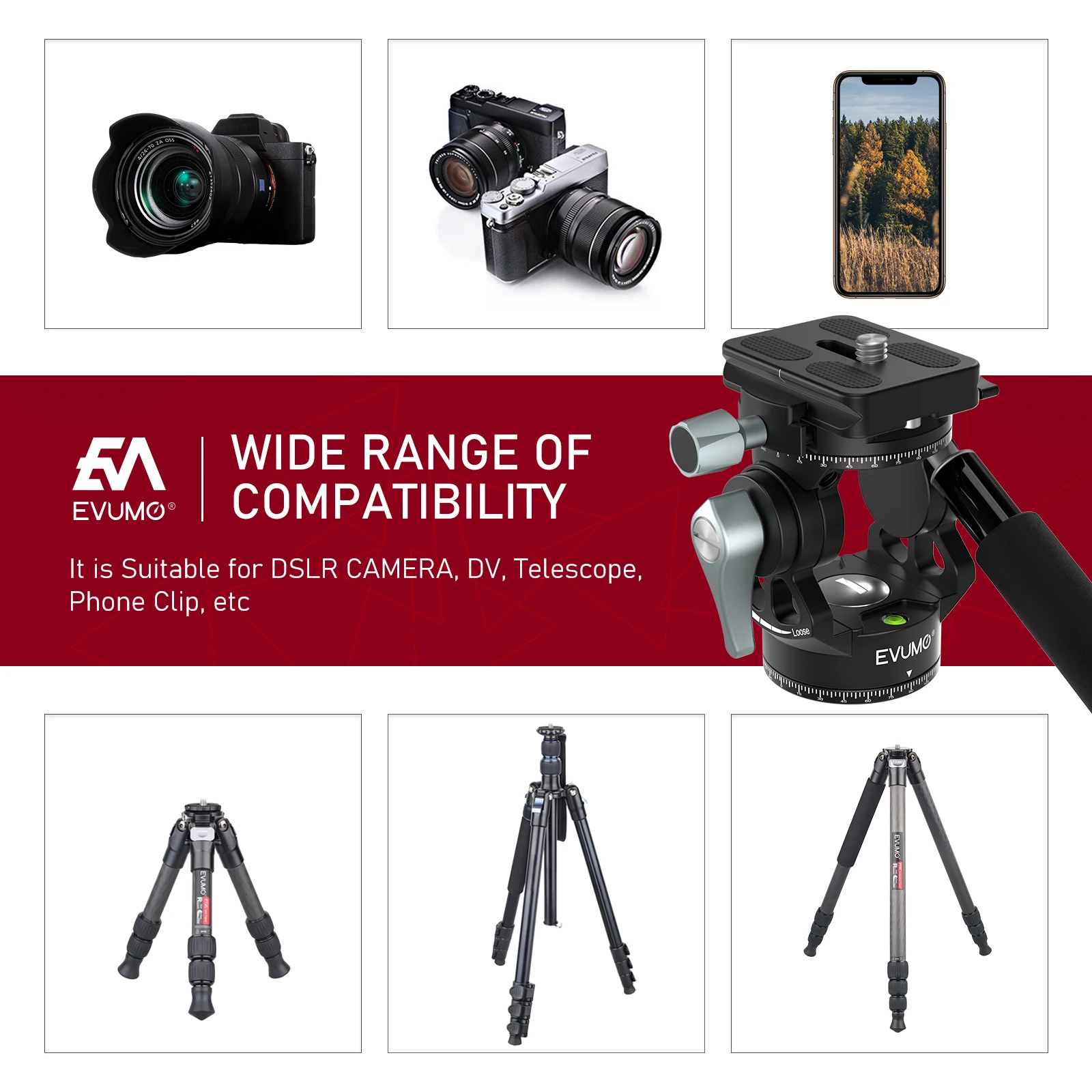 Trous de vis de 3/8″ au bas de la tête vidéo et trépied, monopode, mini trépied facile à installer. Plaque de dégagement rapide de 1/4 pouces pour la plupart des appareils photo reflex numériques, facile à installer et à démonter.