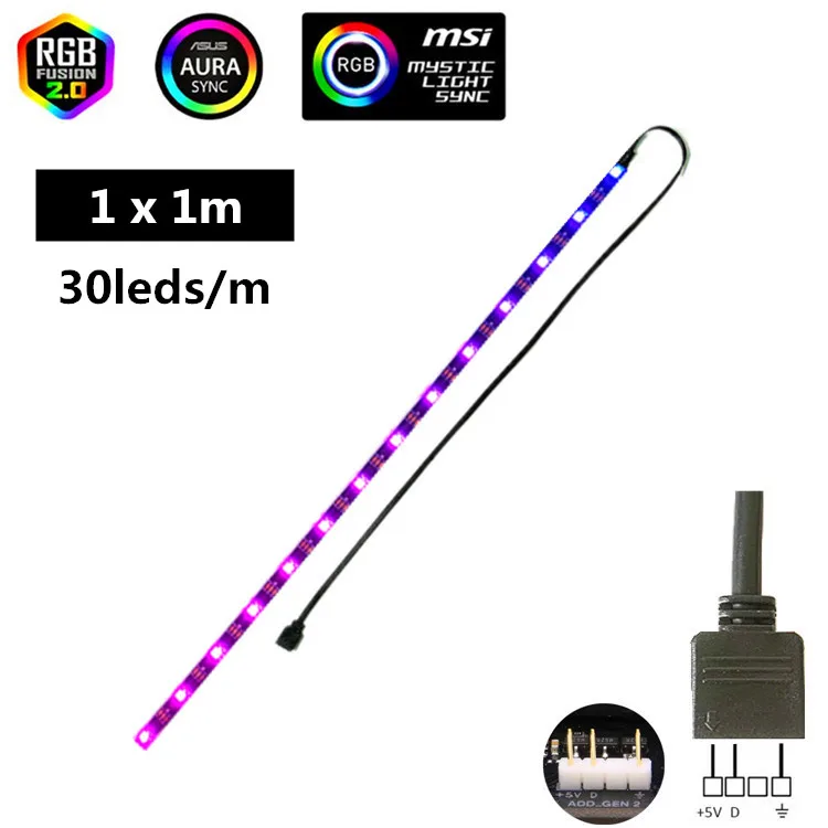 Cette bande LED pour boîtier PC est conçue pour fonctionner avec les systèmes ASUS AURA SYNC, MSI Mystic Light et GIGABYTE RGB Fusion 2.0. Elle est dotée d’un modèle IC WS2812b et d’une source lumineuse LED RVB 5050. La bande contient 30 LED par mètre ou 60 LED par mètre, selon votre choix. La longueur du câble est de 50 cm et vous pouvez ajouter un séparateur de câble de 30 cm si nécessaire. Elle fonctionne avec une tension de 5V et est disponible en versions non étanches IP30 ou étanches IP65. Les broches sont définies comme suit : + 5V, D, N/A, GND. La bande LED ne doit pas être connectée à une broche 12V RGB_HEADER, cela pourrait endommager la bande entière.