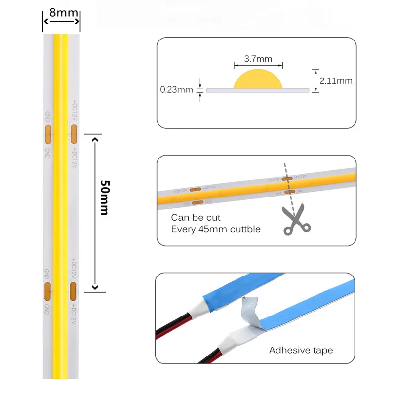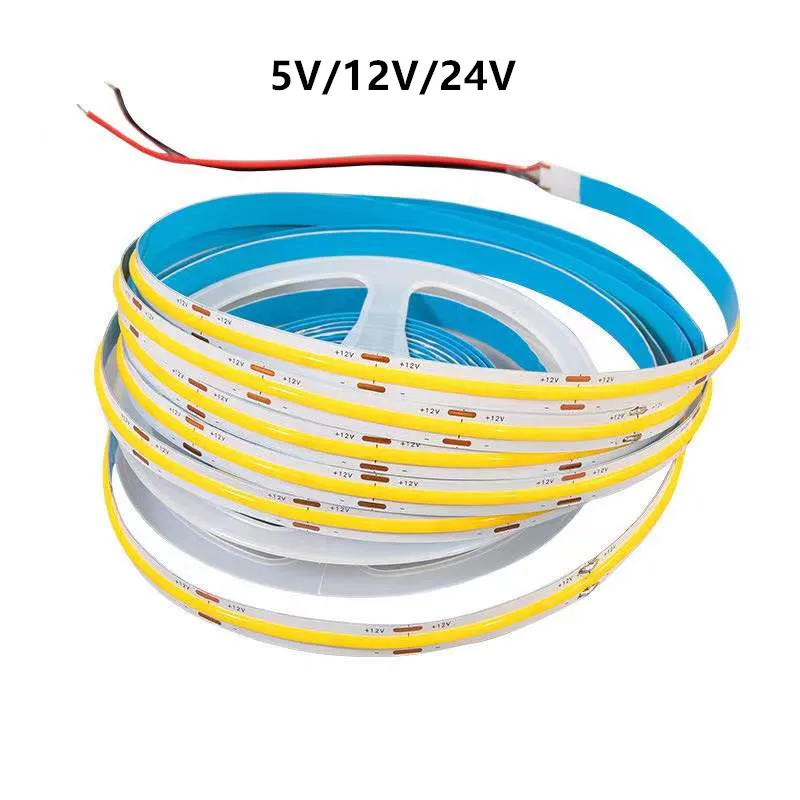 La bande lumineuse LED COB haute densité est compatible avec les sources d’alimentation DC5V, DC12V et DC24V.