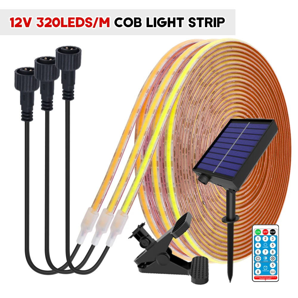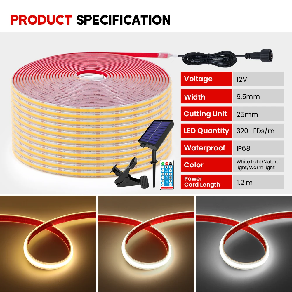 La bande solaire LED COB est également disponible en différentes températures de couleur (3000K, 4000K, 6000K) afin de s’adapter aux préférences et aux besoins spécifiques de chaque utilisateur.