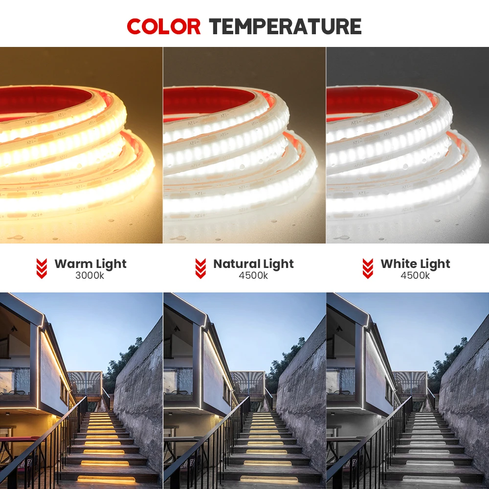 En conclusion, la bande solaire LED COB étanche IP68, 12V, 320LED/m, FOB, RA90, 3000K, 4000K, 6000K, éclairage linéaire extérieur haute densité est un produit de haute qualité qui offre une luminosité exceptionnelle et une grande flexibilité d’utilisation.
