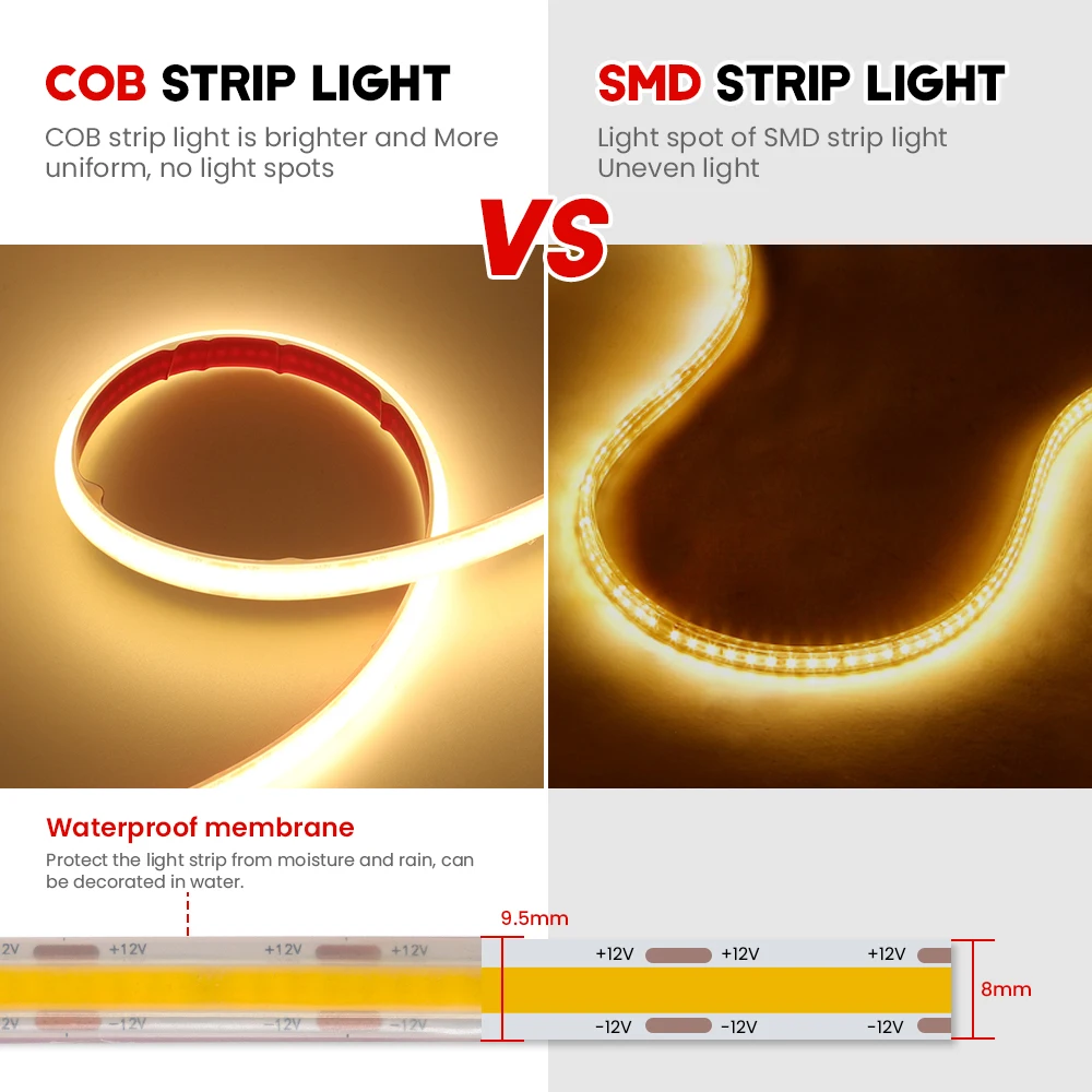 Test et avis sur la bande solaire LED COB étanche IP68, 12V, 320LED/m, FOB, RA90, 3000K, 4000K, 6000K, éclairage linéaire extérieur haute densité