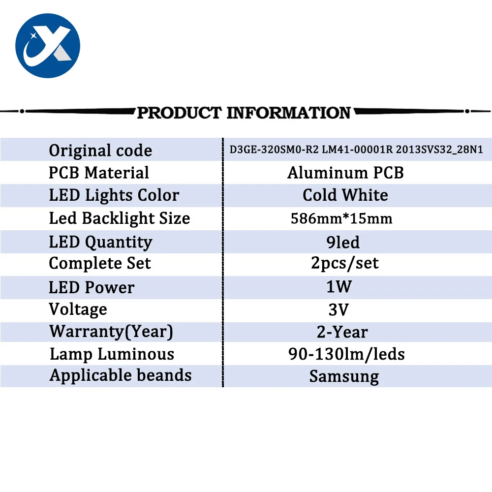 Le bande de rétroéclairage Led 3V, pour Samsung 32FH D3GE-320SM0-R2 LM41-00001R, 2 pièces, UN32EH4003 est un produit essentiel pour la réparation des télévisions Samsung. Il est compatible avec plusieurs modèles de télévision Samsung, ce qui en fait un choix polyvalent pour les techniciens et les amateurs de bricolage. Sa longueur de 586mm en fait un remplacement précis pour les bandes de rétroéclairage défectueuses.