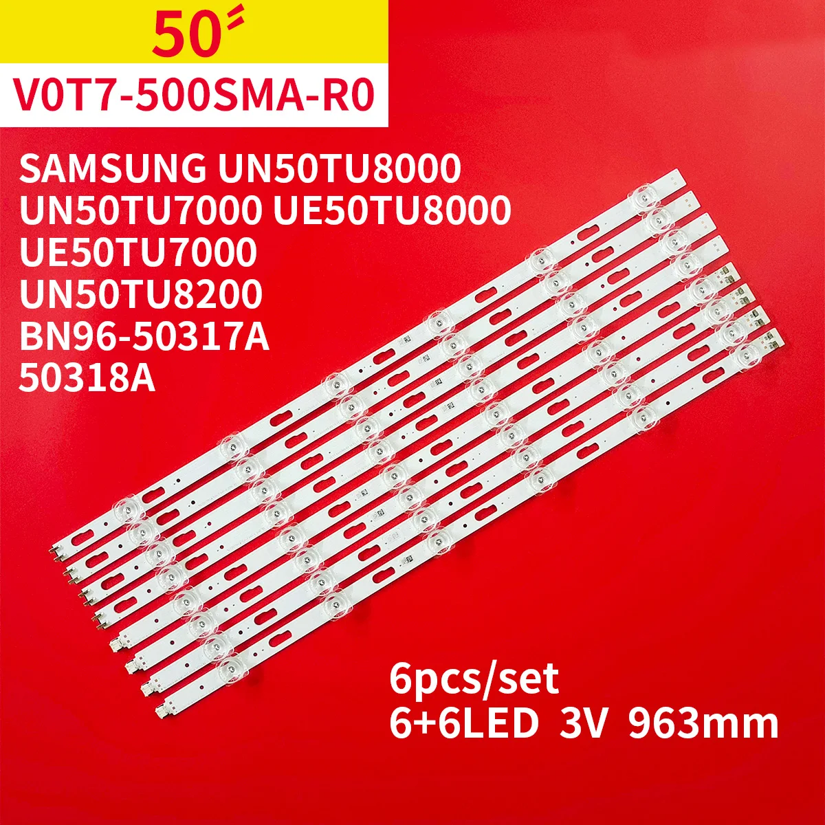 Ce produit est compatible avec les modèles de téléviseurs suivants : Samsung UN50TU8000, Samsung UN50TU7000, Samsung UE50TU8000, Samsung UE50TU7000, Samsung UN50TU8200, V0T7-500SMA-R0, 500SMB-R1, BN96-50317A, BN96-50318A.