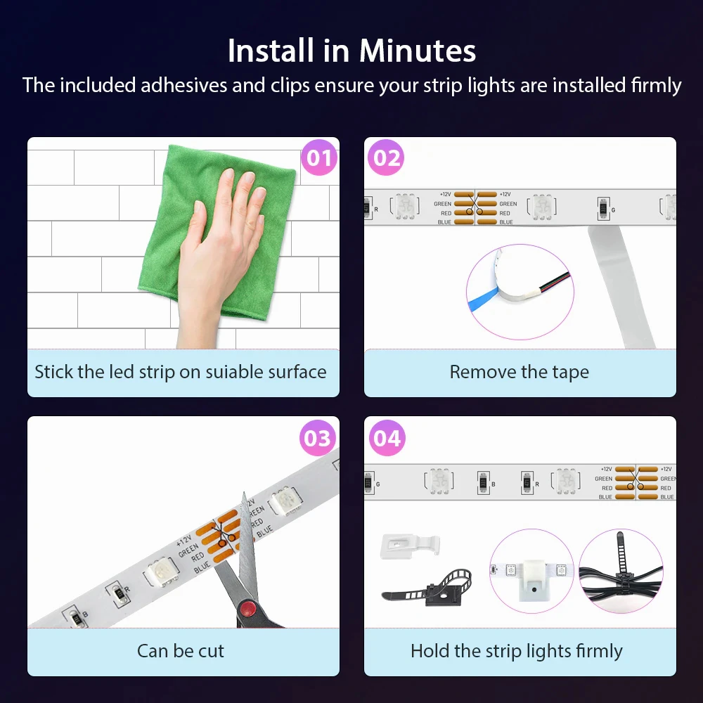 La bande lumineuse LED peut être facilement installée en la fixant avec adhésif sur une surface propre et sèche.
