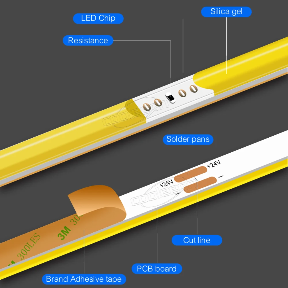 - La bande COB est articulée par une bande de 50cm, il y a donc des points articulés (soudure) sur la bande, c’est très normal!!!
