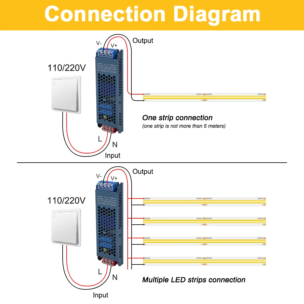 - La bande ne peut pas se connecter à 220V ou 110V directement!!! Il faut un transformateur 12V/24V!!!