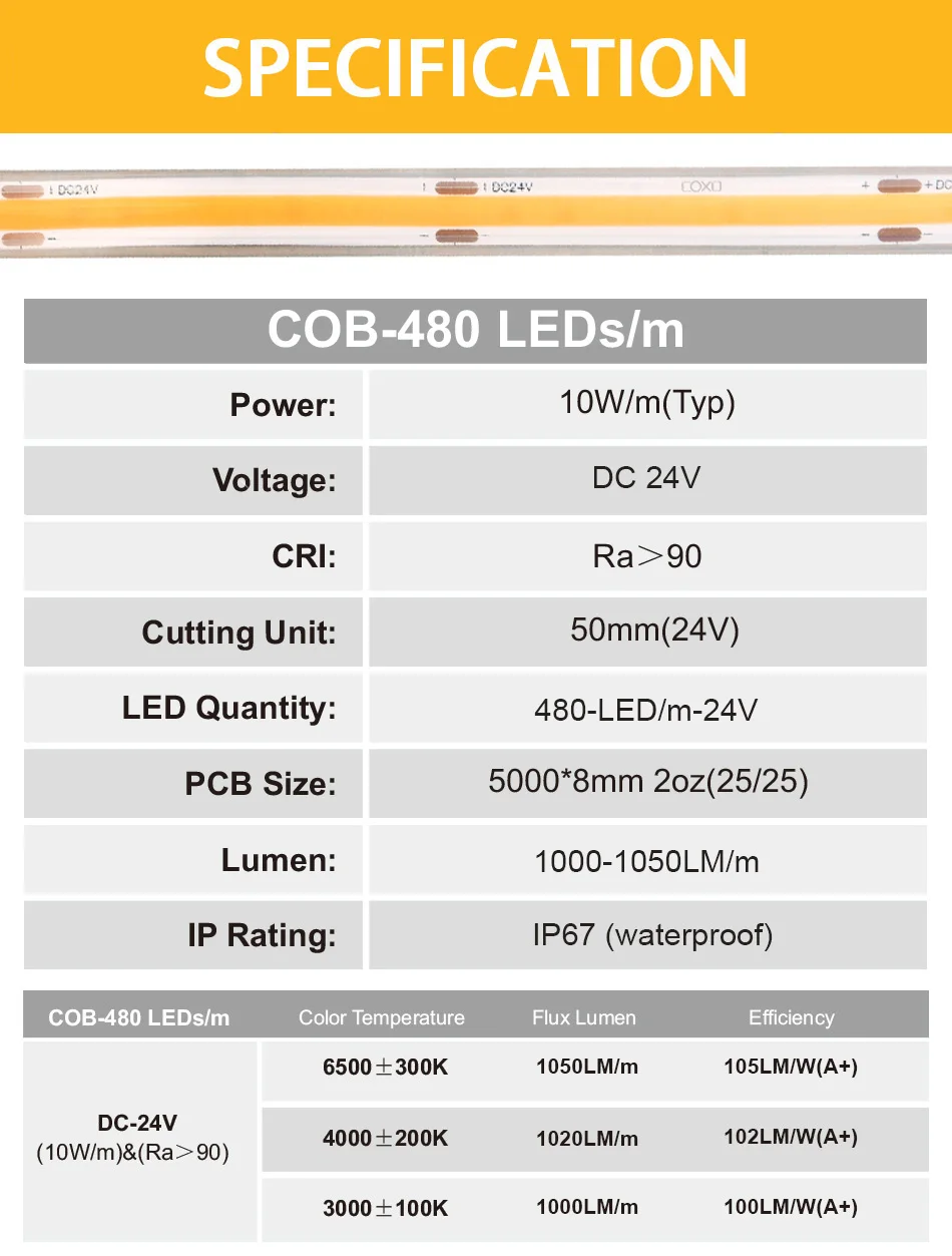 - Longueur de coupe: 480 leds/m: DC24V-50mm
