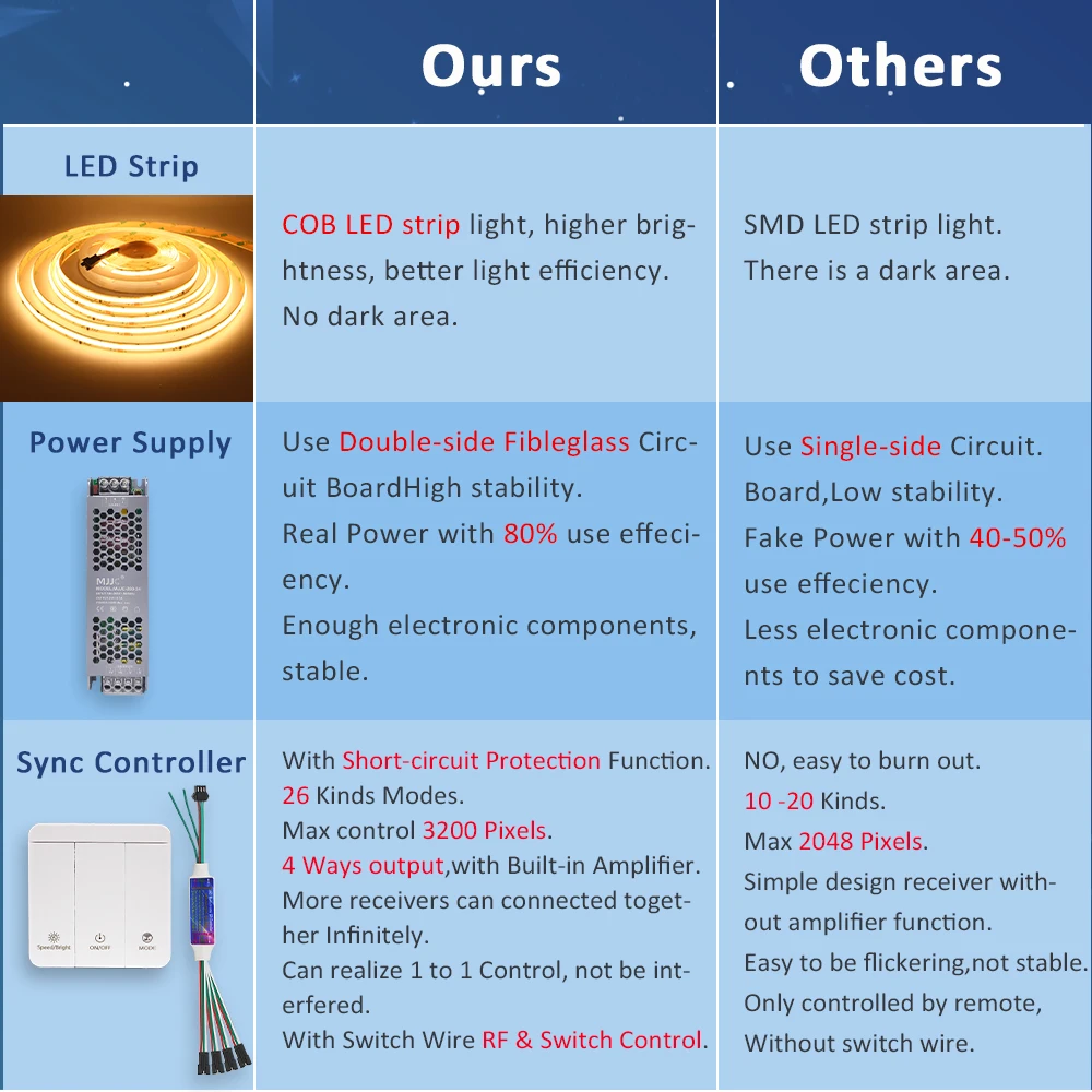 Pour régler les pixels de la bande lumineuse, vous devez utiliser la télécommande. Éteignez d’abord les lumières, puis maintenez le bouton « Mode » enfoncé pendant 5 secondes. Utilisez ensuite le bouton « Vitesse » pour augmenter ou diminuer le nombre de pixels. Enregistrez ensuite les paramètres en appuyant sur le bouton « ON/OFF ».