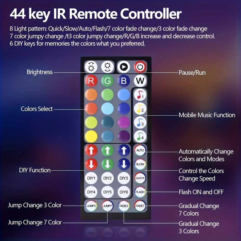 | Options de double contrôle | Contrôlez la couleur, le mode d’éclairage, la luminosité et la vitesse lumineuse via la télécommande et l’application |