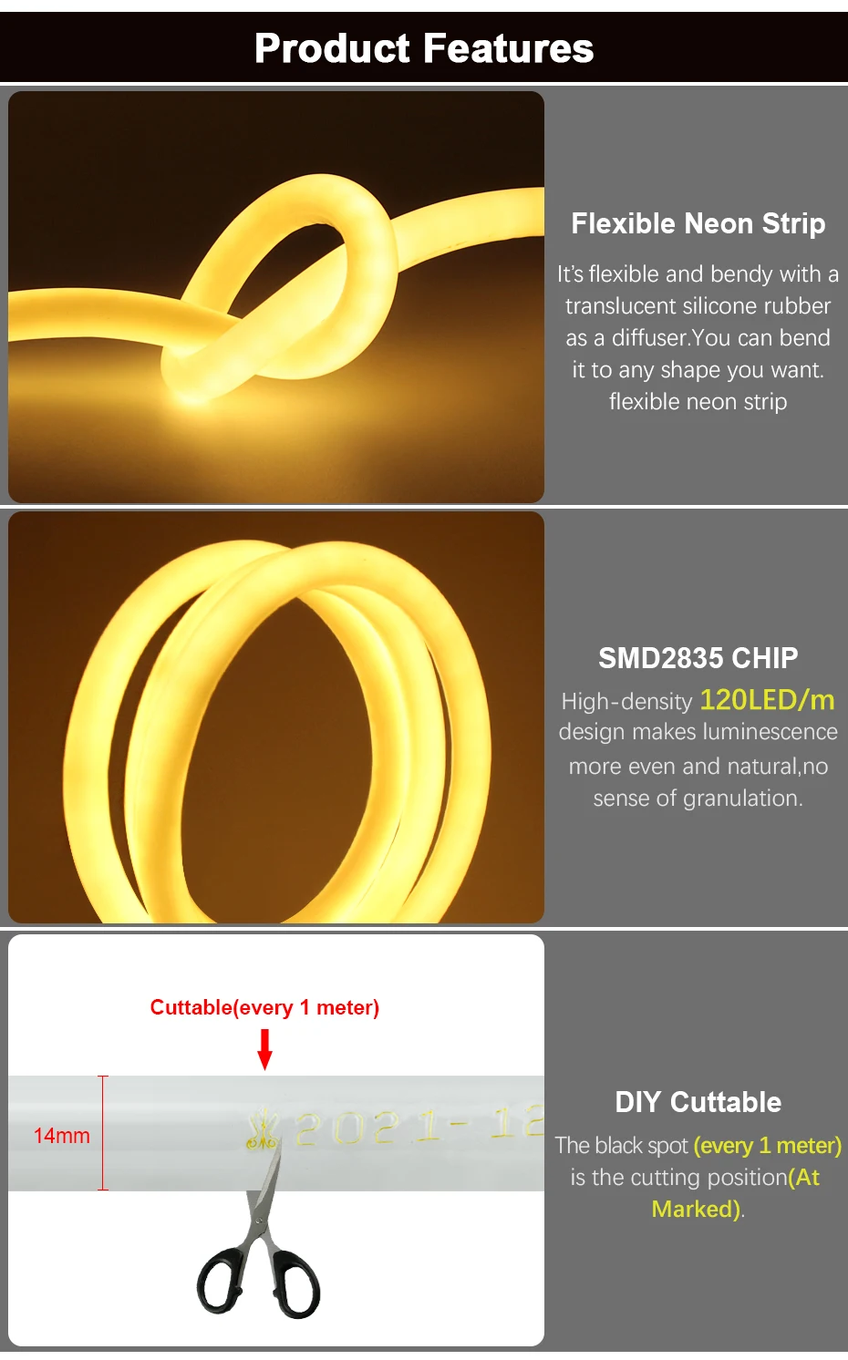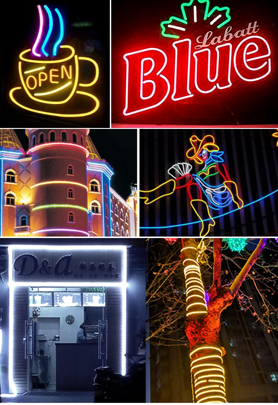 La bande lumineuse néon flexible est parfaite pour la décoration de la maison. Ce tube rond est équipé d’une prise UE et est étanche IP67, ce qui signifie qu’il peut être utilisé à l’extérieur sans aucun problème. La longueur de la bande peut être ajustée de 1m à 220m selon vos besoins. Elle est équipée de 120 LED par mètre, ce qui offre un éclairage puissant et homogène. Disponible en différentes couleurs, la bande lumineuse néon flexible s’adapte à tous les styles de décoration.