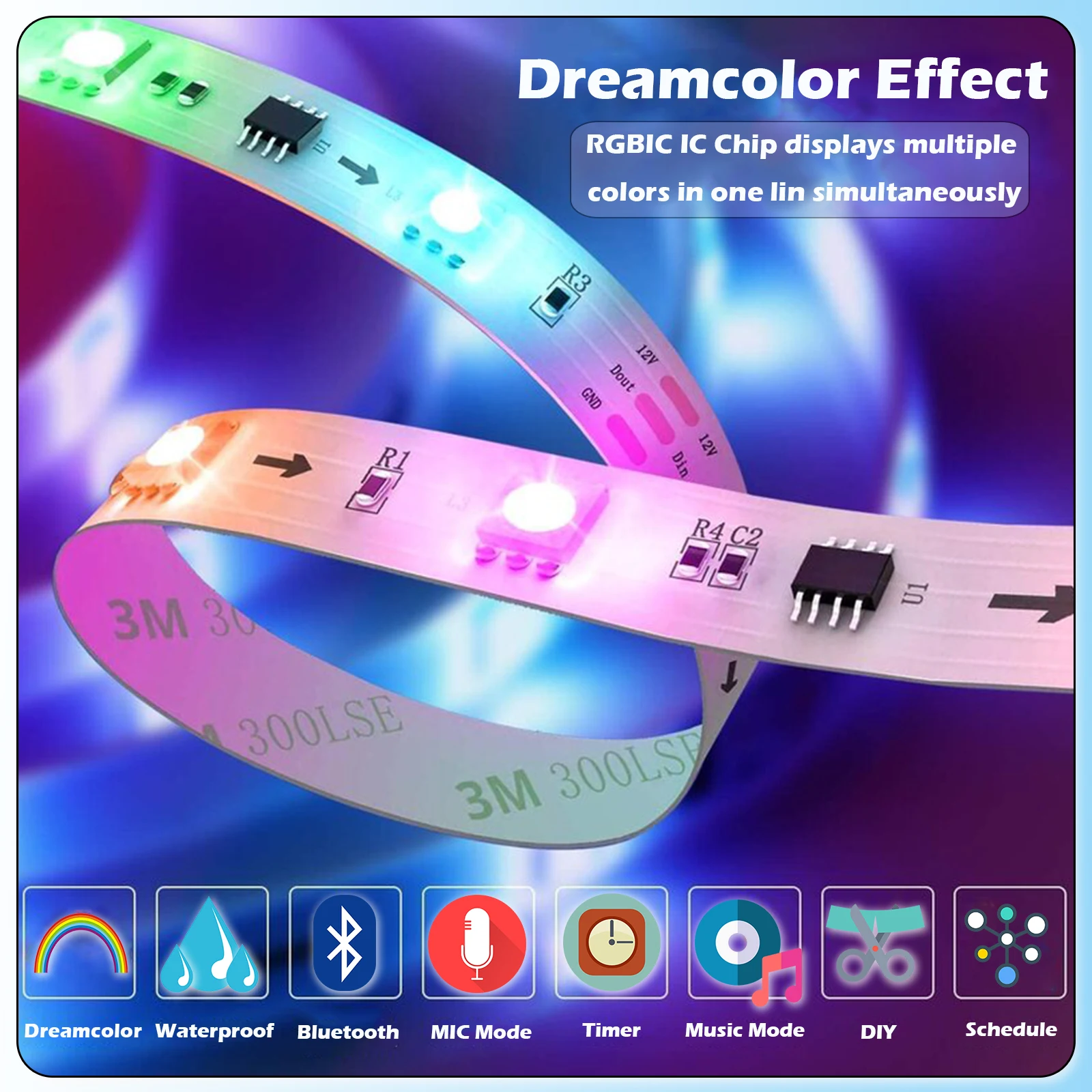 [Couleur de rêve chassant les lumières adressables de bande de WS2811 LED]: effets intelligents de RGBIC: à ladifférence de rvb, les lumières de bande de RGBIC LED présentent les couleurs segmentées superbes sur une ligne.