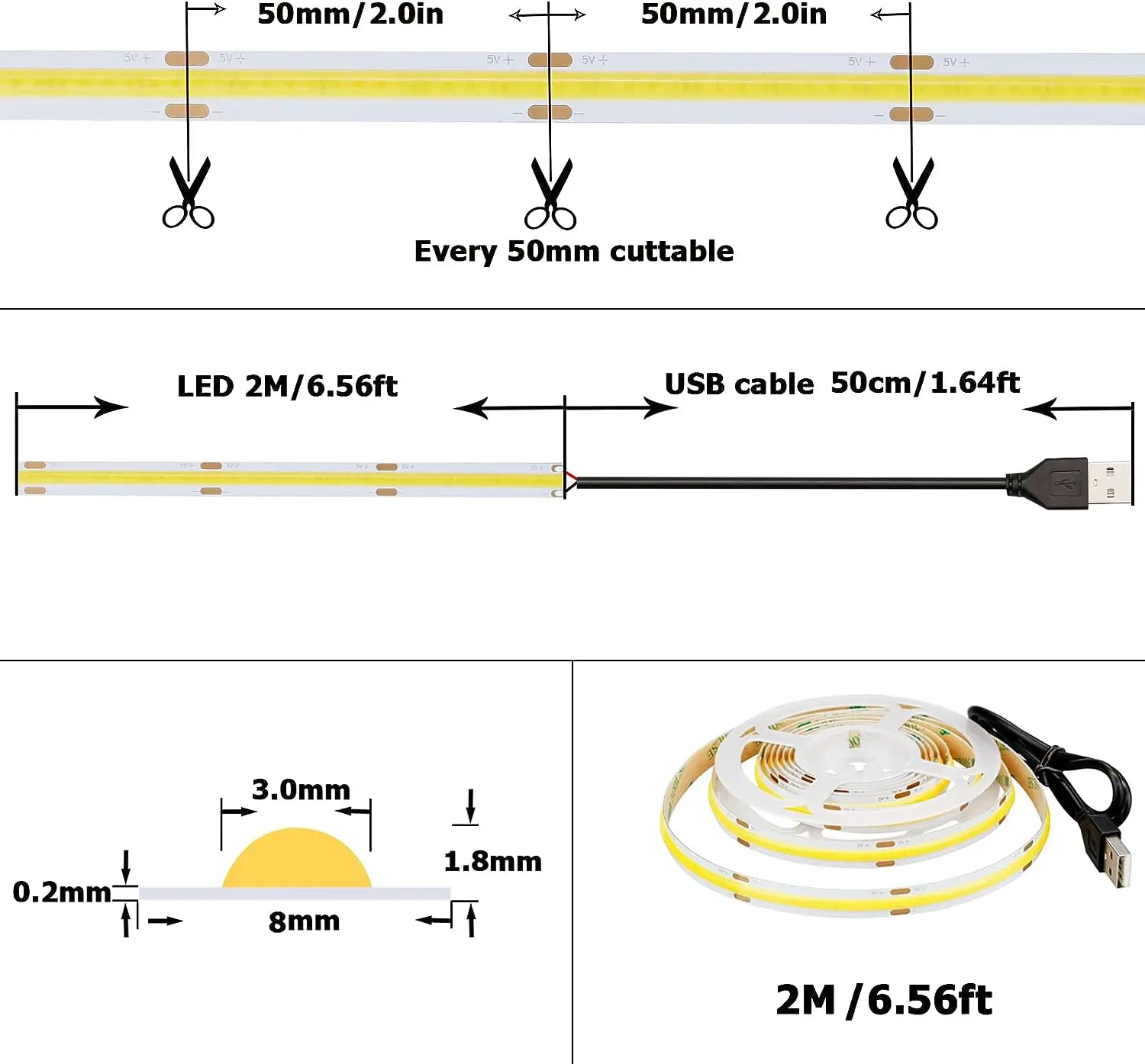 Cette bande lumineuse LED COB peut être facilement allumée en connectant simplement le câble à la borne USB du PC ou similaire. Avec 320LED/m, elle fournit une luminosité suffisante tout en économisant de l’énergie.