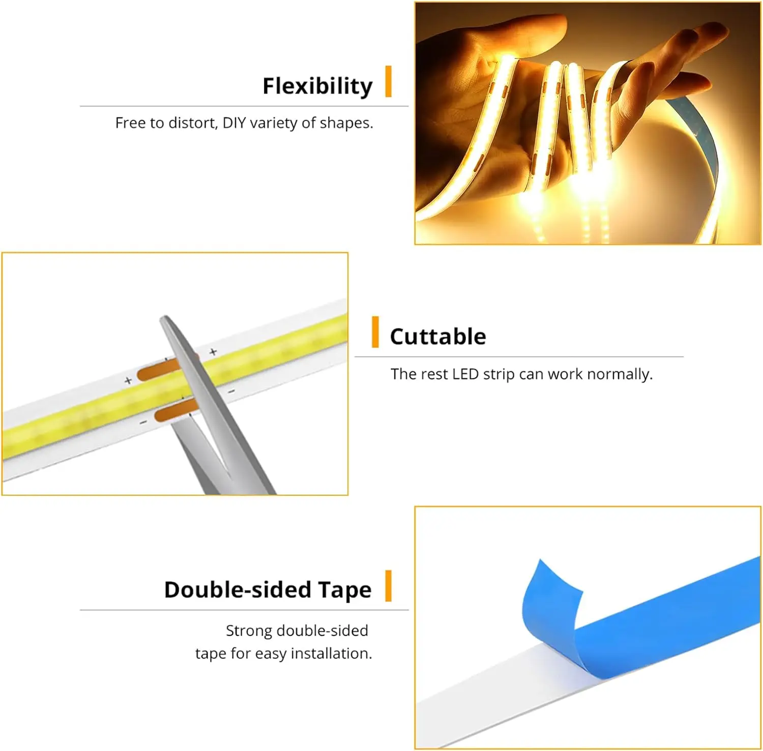 La bande lumineuse LED COB émet une lumière douce et uniforme grâce à sa surface d’émission de lumière COB à haute densité et à son angle de flux lumineux de 239°. Elle est confortable, douce et inoffensive pour la peau et les yeux. De plus, elle a un indice de rendu des couleurs élevé et offre un bon effet d’éclairage.