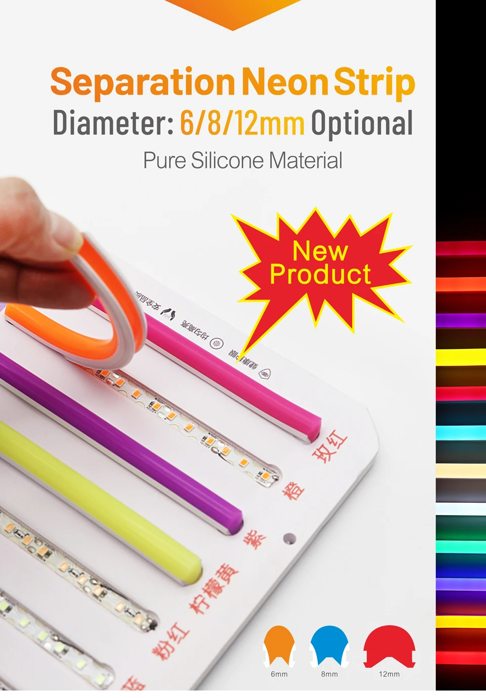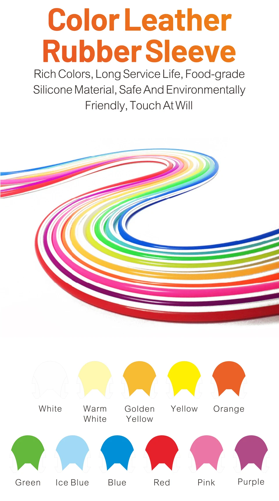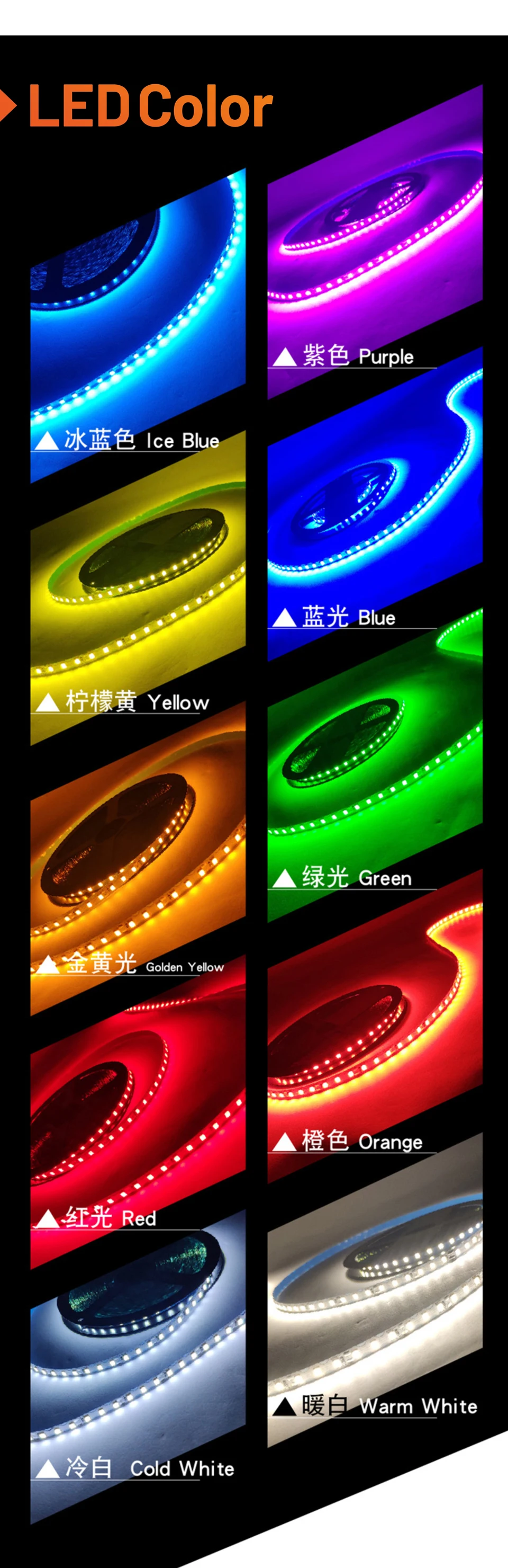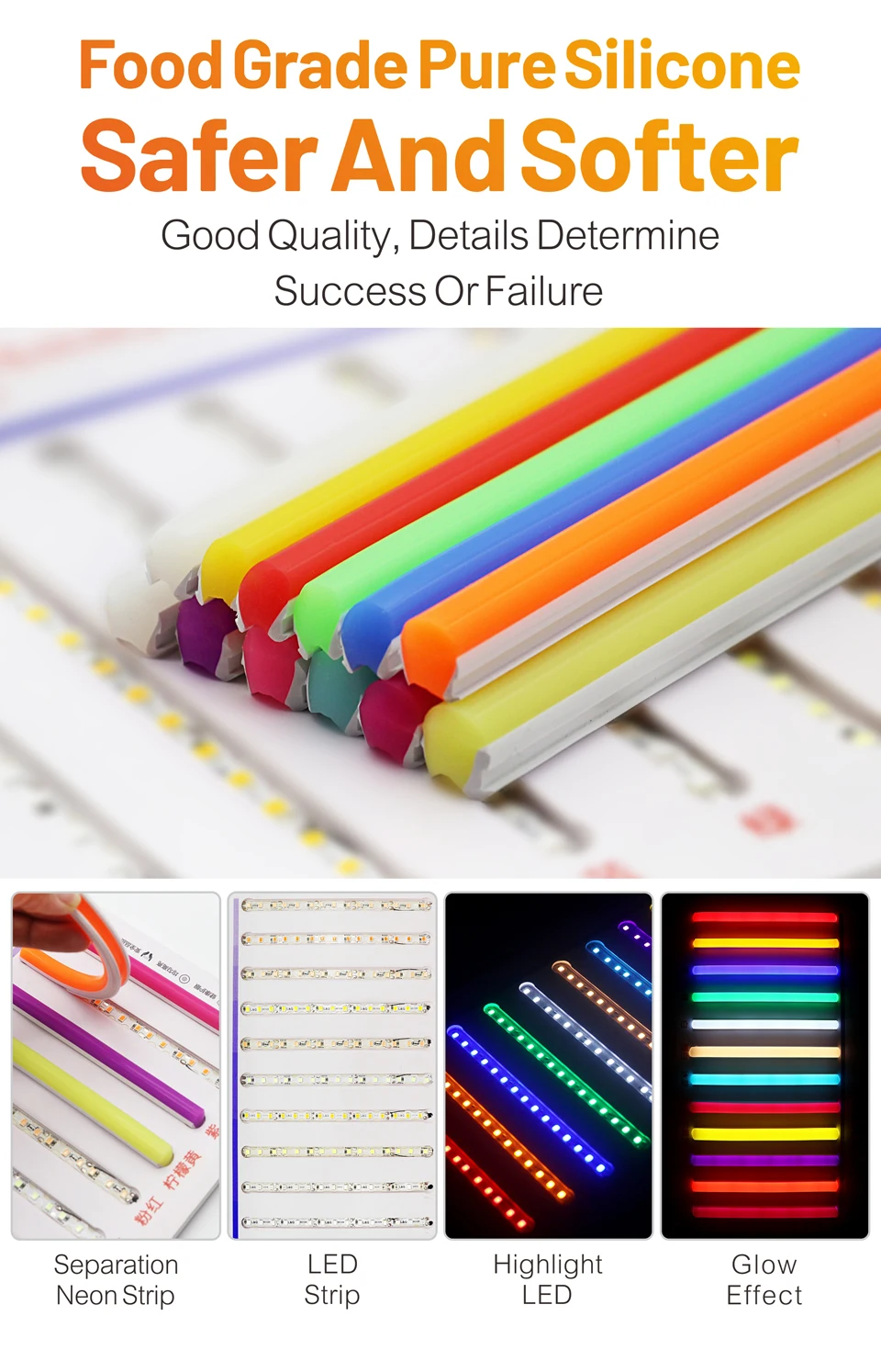 | Silicone de qualité alimentaire | Blanc, Blanc chaud, Jaune doré, Jaune, Orange, Vert, Bleu glacier, Bleu, Rouge, Rose, Violet | 120 LEDS/M | IP67 étanche (adhésif étanche requis) | DC12V | 120° | -40 à 60°C | 50,000 heures |