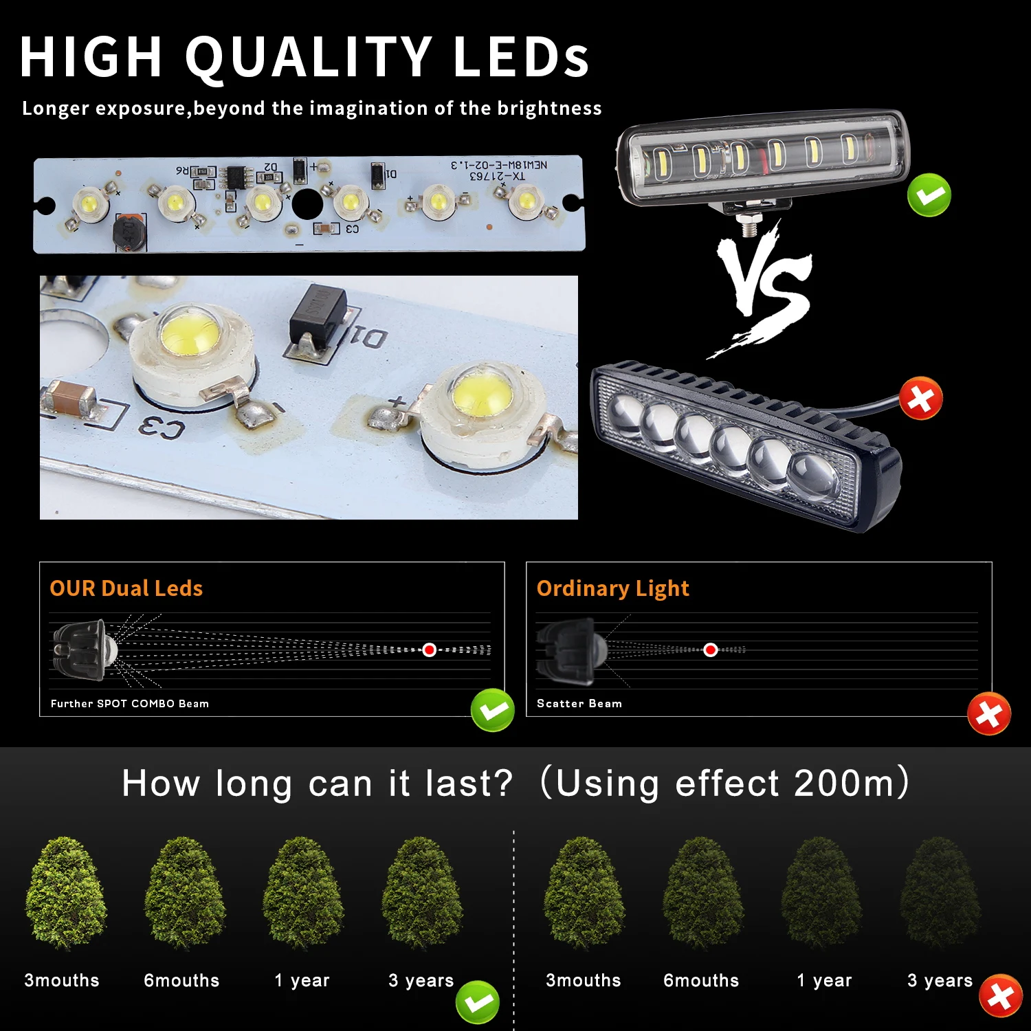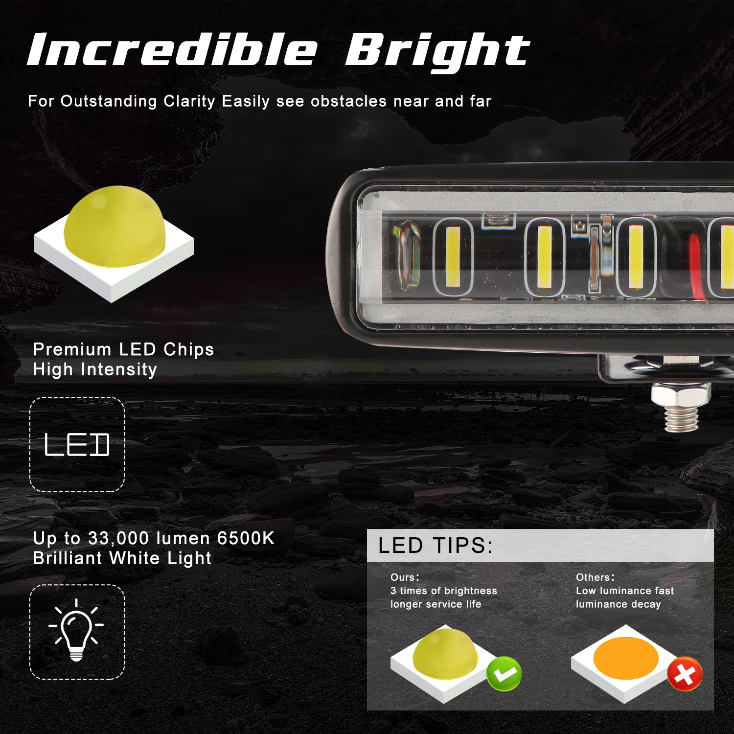 Les clients apprécient la puissance et la luminosité de la barre lumineuse LED 7″. Le boîtier en aluminium extrudé et la tasse de lumière optique 8D garantissent une fonction antichoc et étanche de haute qualité. La perception de la lumière douce empêche l’éblouissement. La barre lumineuse est également très appréciée pour sa résistance à l’eau et à la corrosion.