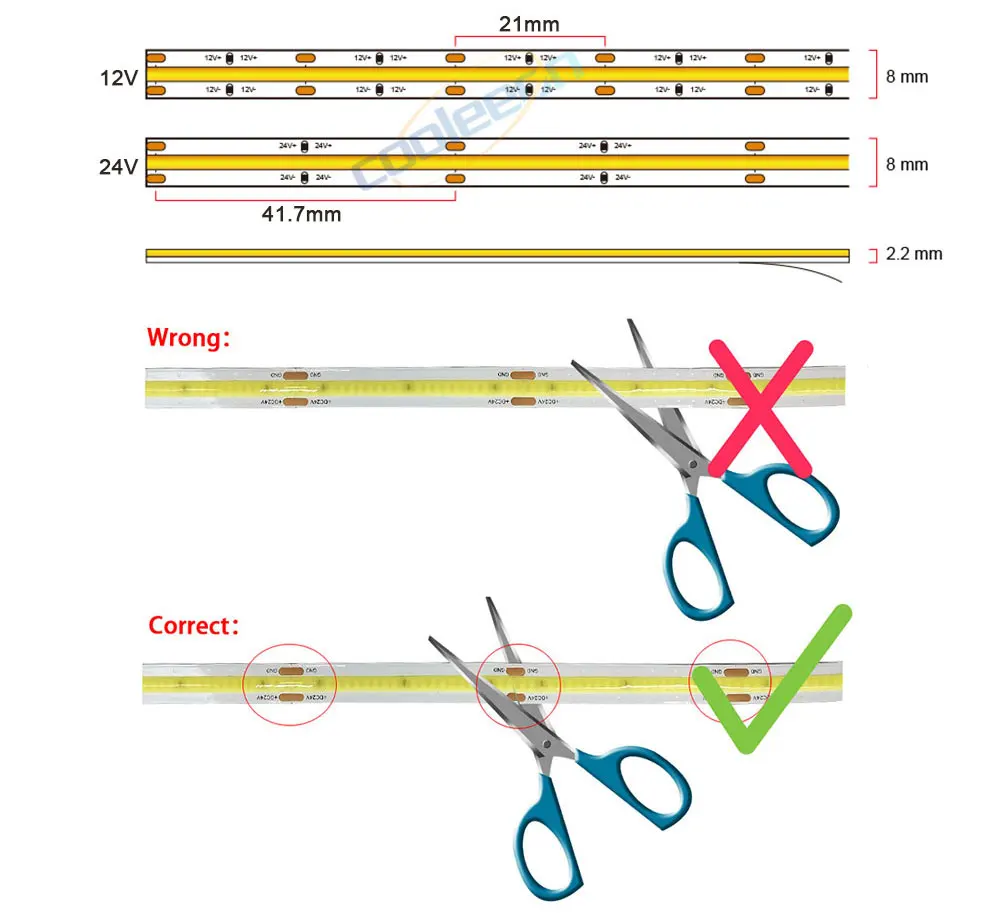 Il y a un point de soudure à chaque endroit de 41.5mm sur la bande, de sorte que vous pouvez couper à n’importe quel point de soudure.