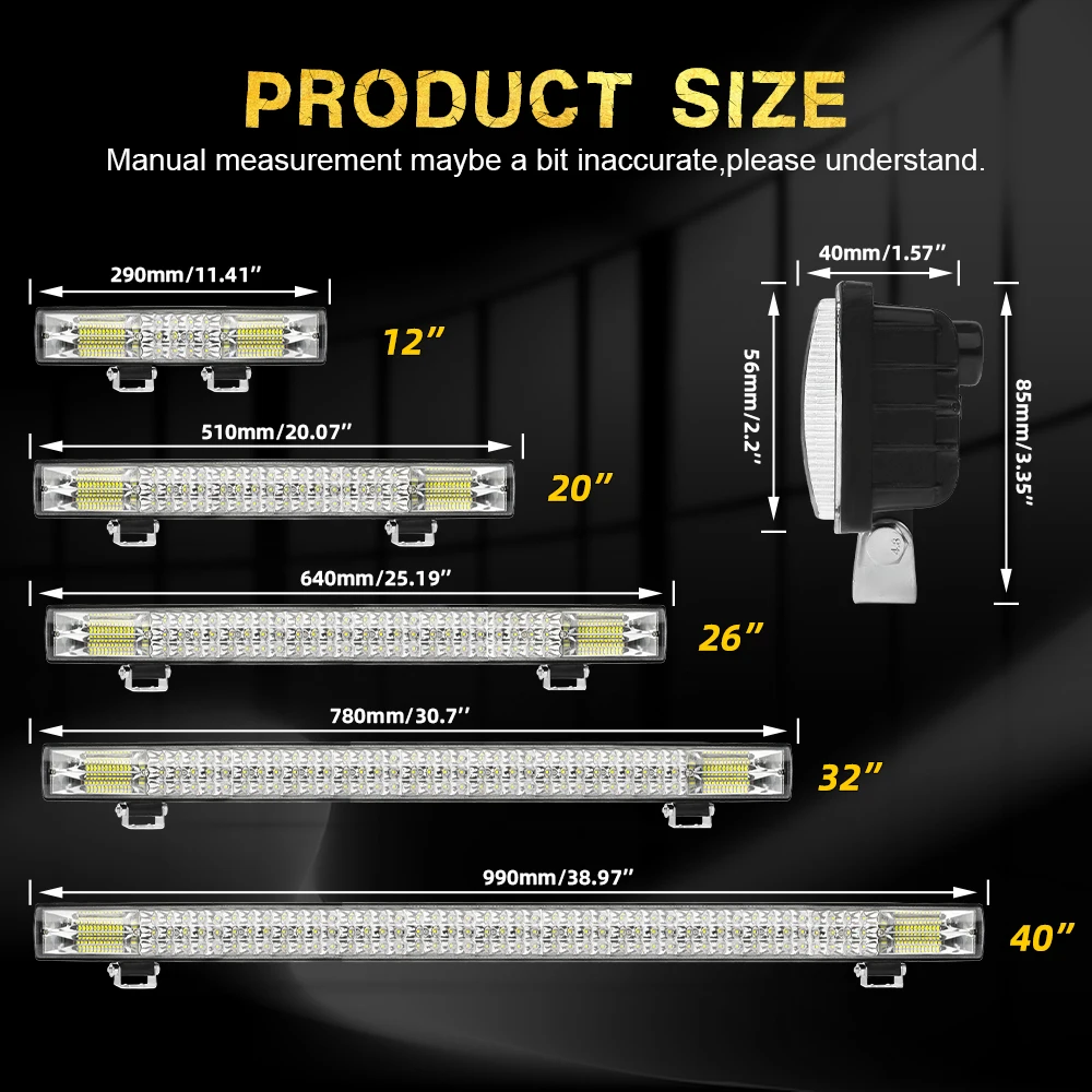 | Barre lumineuse de travail à LED pour tracteur RL, lumière de sauna, budgétaire de voiture, lampe antibrouillard à diode, moto tout-terrain, accessoires 4×4, 3 rangées, 12 V-24V | 3 | Noir | 10V-30V | Colight | 12 « 20000LM 20 « 40000LM 26 « 55000LM 32 « 70000LM 40 « 110000LM | – 40 ˚C à + 85 ˚C | IP68 | Faisceau spot de 30 ° et faisceau d’inondation de 160 ° | 50000 heures |