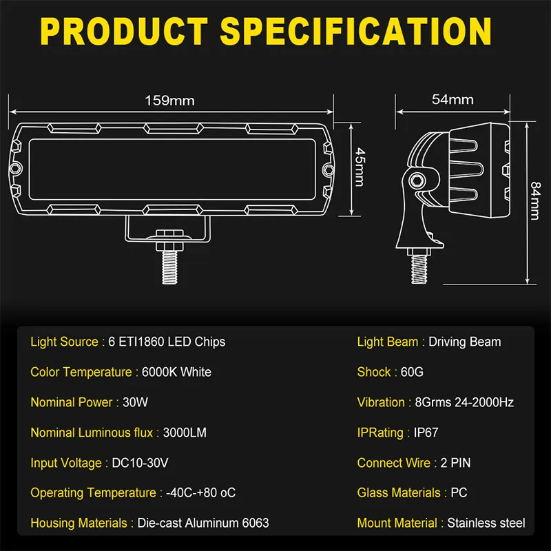 • Source de lumière: 6pcs ETI1860 LED Chips (30W 7D Bar 6″)