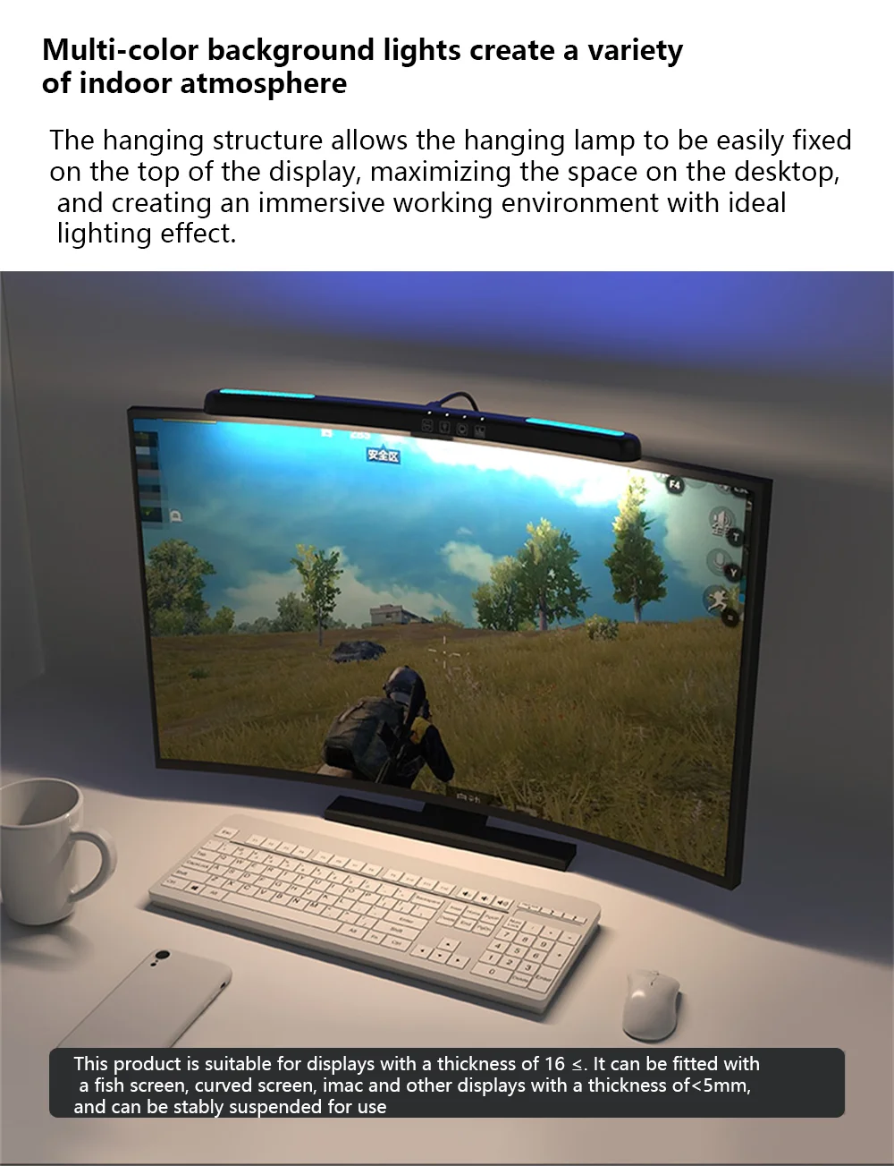 - Lumière de fond multicolore: la structure suspendue permet à la lampe suspendue d’être facilement fixée sur le dessus de l’écran, maximisant l’espace sur le bureau, et réalisant les effets de la lumière idéaux pour créer un environnement de travail immersif.