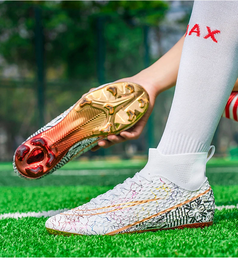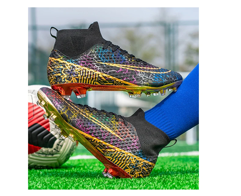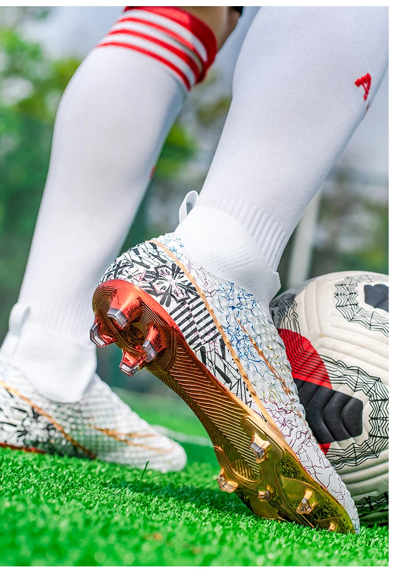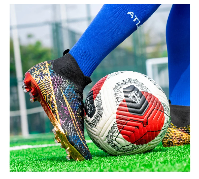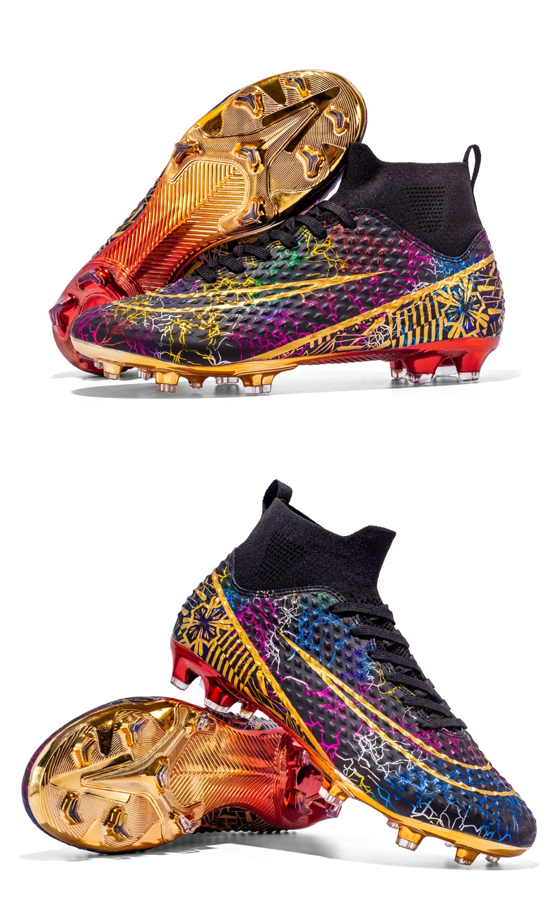Les chaussures de football montantes pour hommes sont idéales pour les joueurs professionnels. Elles offrent un bon maintien du pied grâce à leur design montant. Les pointes coordonnantes assurent une adhérence optimale sur tous les terrains. De plus, les chaussures sont plaquées or, ce qui leur confère une allure élégante et luxueuse. Elles conviennent aussi bien à l’entraînement professionnel qu’à une utilisation en extérieur, en faisant des baskets polyvalentes.