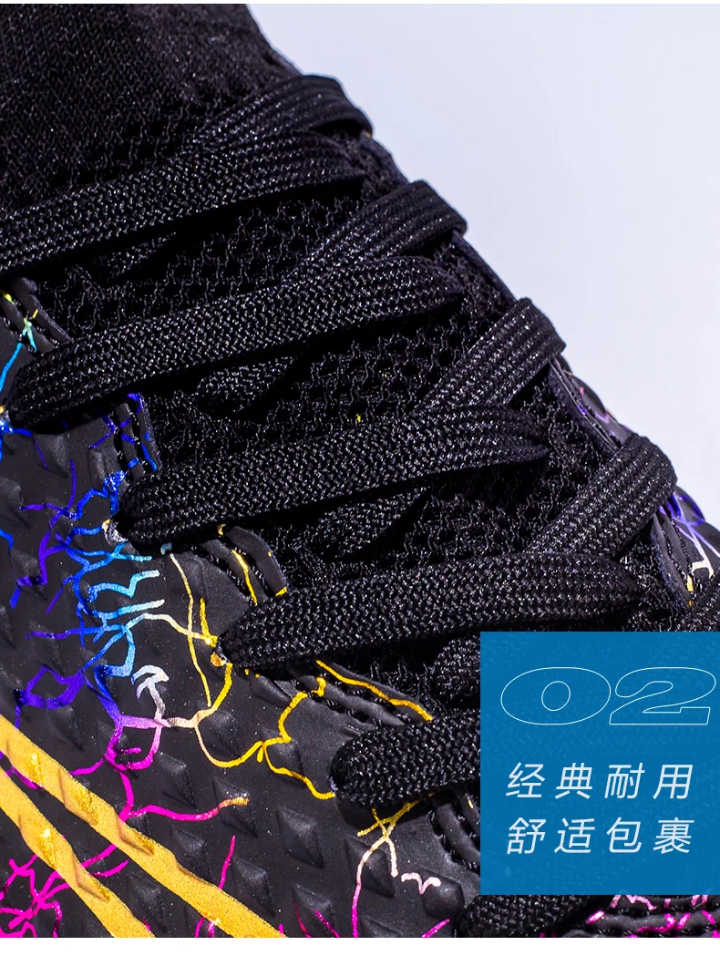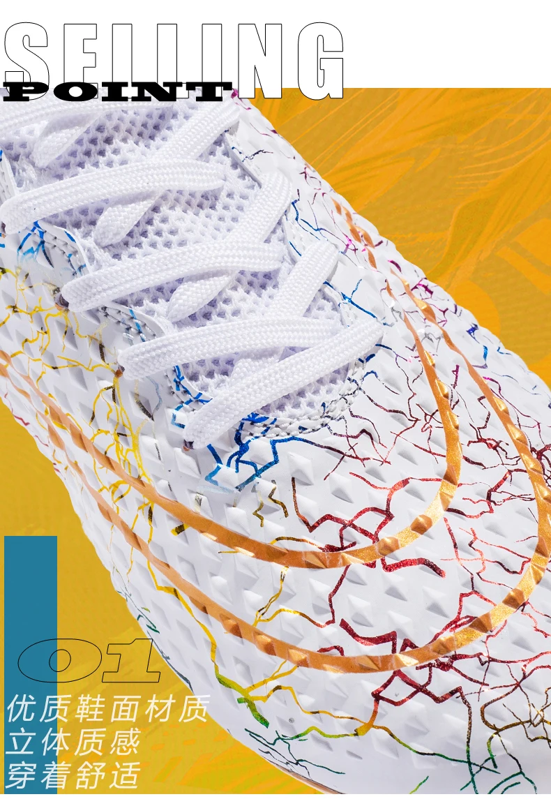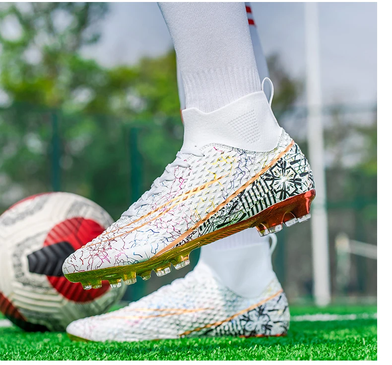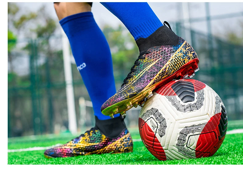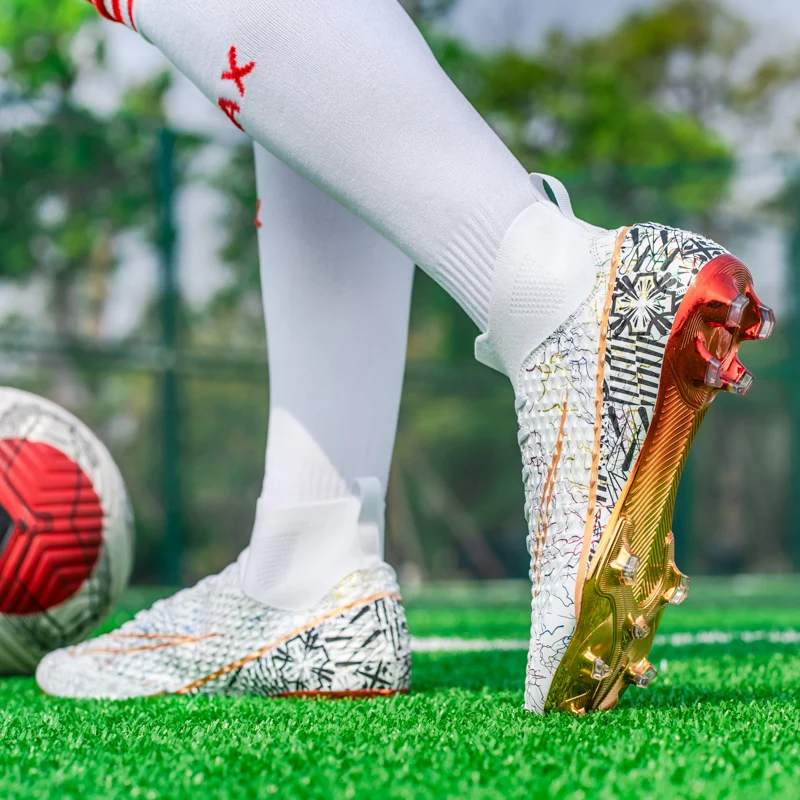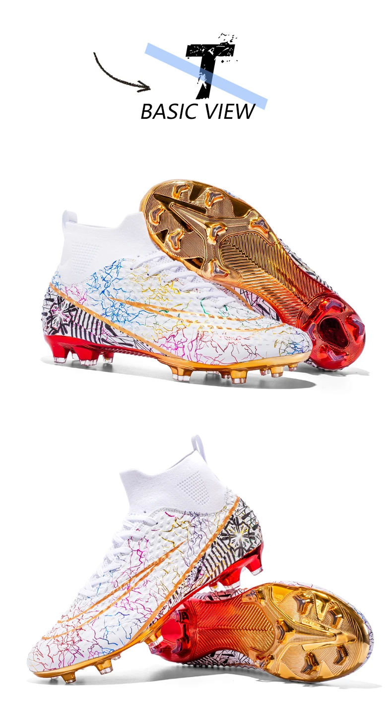 Les chaussures de football montantes pour hommes sont idéales pour les joueurs professionnels. Elles offrent un bon maintien du pied grâce à leur design montant. Les pointes coordonnantes assurent une adhérence optimale sur tous les terrains. De plus, les chaussures sont plaquées or, ce qui leur confère une allure élégante et luxueuse. Elles conviennent aussi bien à l’entraînement professionnel qu’à une utilisation en extérieur, en faisant des baskets polyvalentes.
