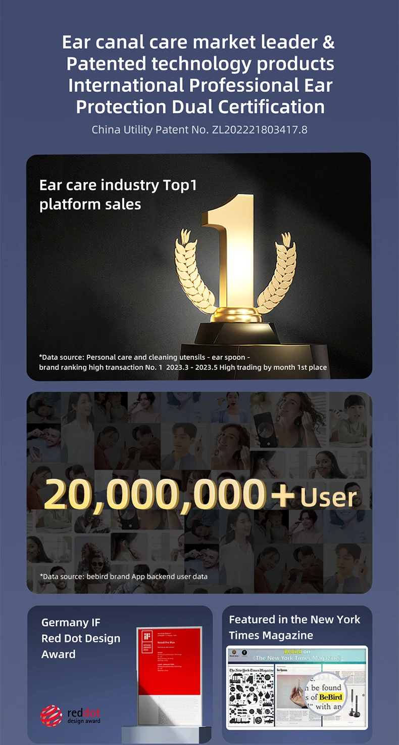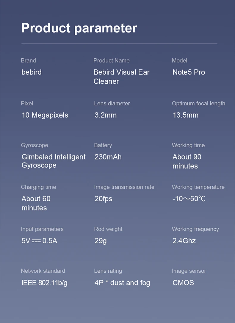 Le Bebird Note 5 Pro est un nettoyeur d’oreille visuel intelligent et polyvalent. Avec sa caméra HD et ses bâtons de suppression d’avertissement d’oreille, il offre une visualisation précise et pratique de l’intérieur de l’oreille. La pince à épiler incluse facilite l’élimination de la cire et des impuretés. Le modèles Note5 et Note5 Pro offrent une qualité d’image exceptionnelle grâce à leur pixel d’objectif de 10 millions et leur diamètre de lentille de 3.2mm. Le gyroscope intelligent universel assure une orientation précise du dispositif. La capacité de la batterie de 230mAh permet une utilisation d’environ 60 minutes. La transmission d’image se fait avec un taux de trame de 20fps et une fréquence de fonctionnement de 2.4Ghz. Le Bebird Note 5 Pro est également compatible avec la norme de réseau IEEE 802.11b/g/n. Le capteur d’image CMOS garantit des images nettes et de haute qualité.