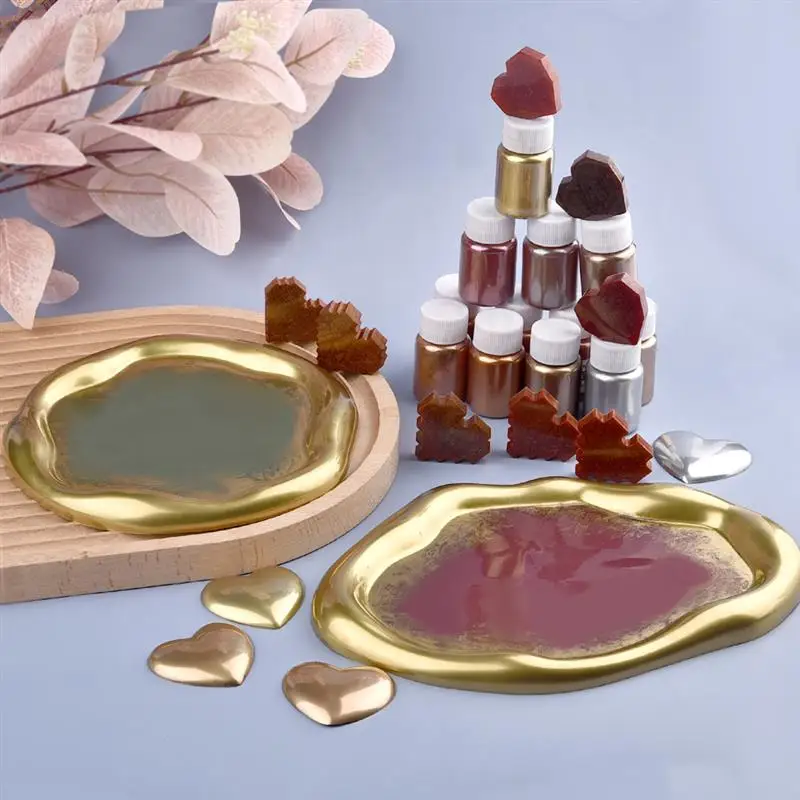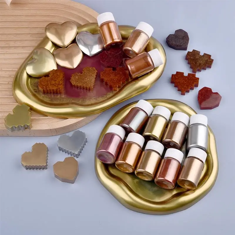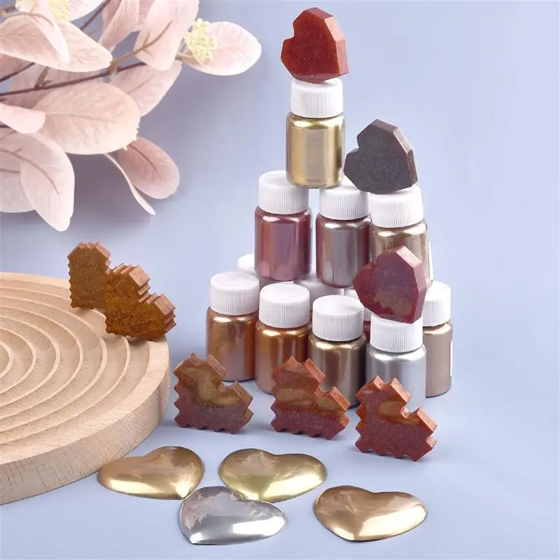 La poudre est disponible dans les couleurs suivantes : argent métallique, or de chaux métallique, or rouge métallique, or métallique, vert brun nacré, café nacré, rouge vin nacré, rouge pourpre nacré, or rouge dragon de feu nacré, rouge nacré brun, bronze nacré, dragon de feu nacré orange or.