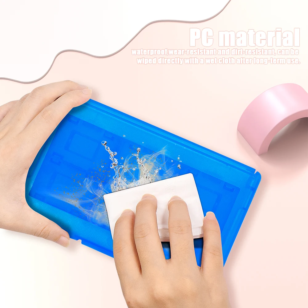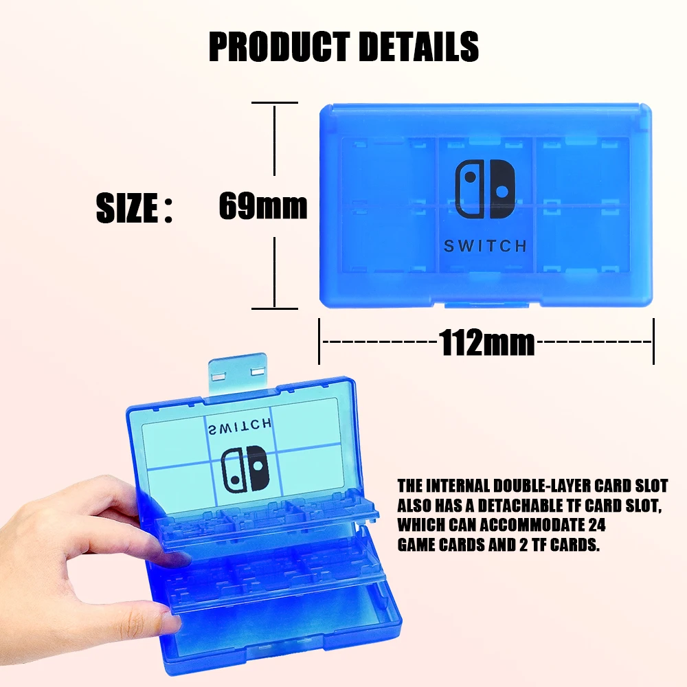 La boîte de rangement pour cartes de jeu 24 en 1 Mini Switch est un étui transparent en ABS étanche pour les cartes SD de la Nintendo Switch Oled. Elle offre une grande capacité pour résoudre facilement les problèmes des joueurs. La couche de placement de cassette est conçue en sandwich pour offrir une meilleure protection, un fonctionnement pratique et de meilleures performances du produit. La surface de matage offre une sensation délicate et exquise.
