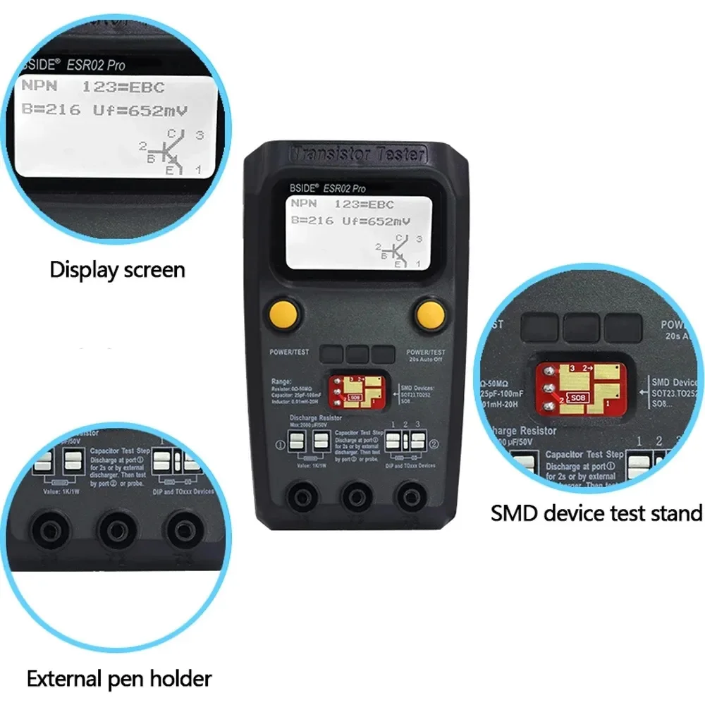 Le testeur BSIDE-ESR02 Pro est un outil pratique conçu pour les ingénieurs, les techniciens électroniques et les usines. Il permet de tester facilement les composants électroniques, tels que les transistors, les diodes, les triodes, les thyristors et les MOSFET. Il est également capable d’analyser différents paramètres, tels que le type de dispositif, la polarité des broches, le hFE de sortie, la tension de seuil, la capacité de jonction, etc.