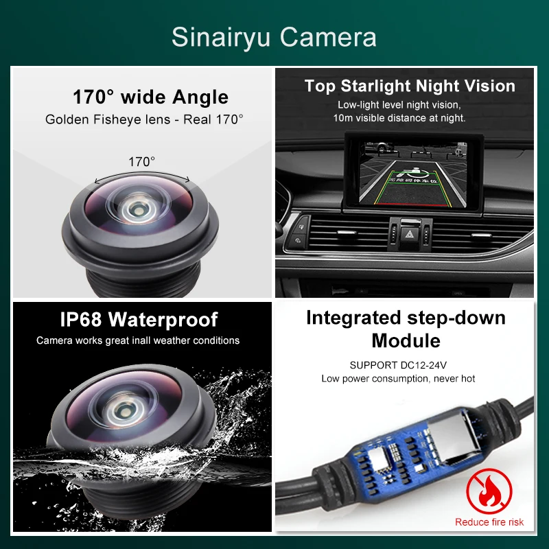 Cette caméra de vue avant de voiture est étanche avec une certification IP68 / IP69, ce qui garantit sa résistance à l’eau et à la poussière. Elle fonctionne avec une tension de DC 12V à 24
