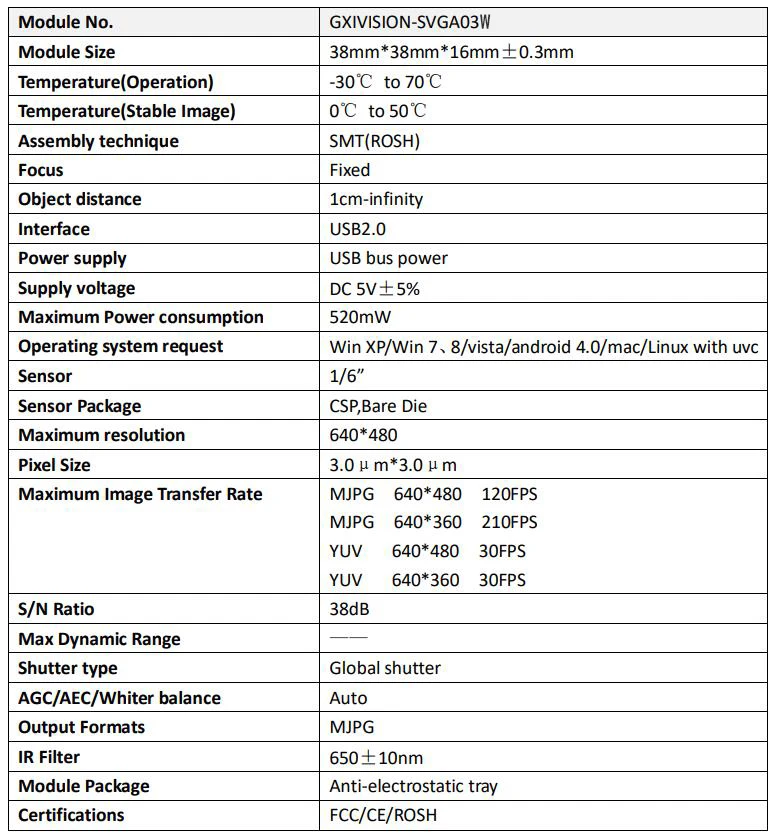 - Taux de trame élevés: MJPG 640*480 120fps, MJPG 640*360 210fps, YUV 640*480 30fps, YUV 640*360 30fps.