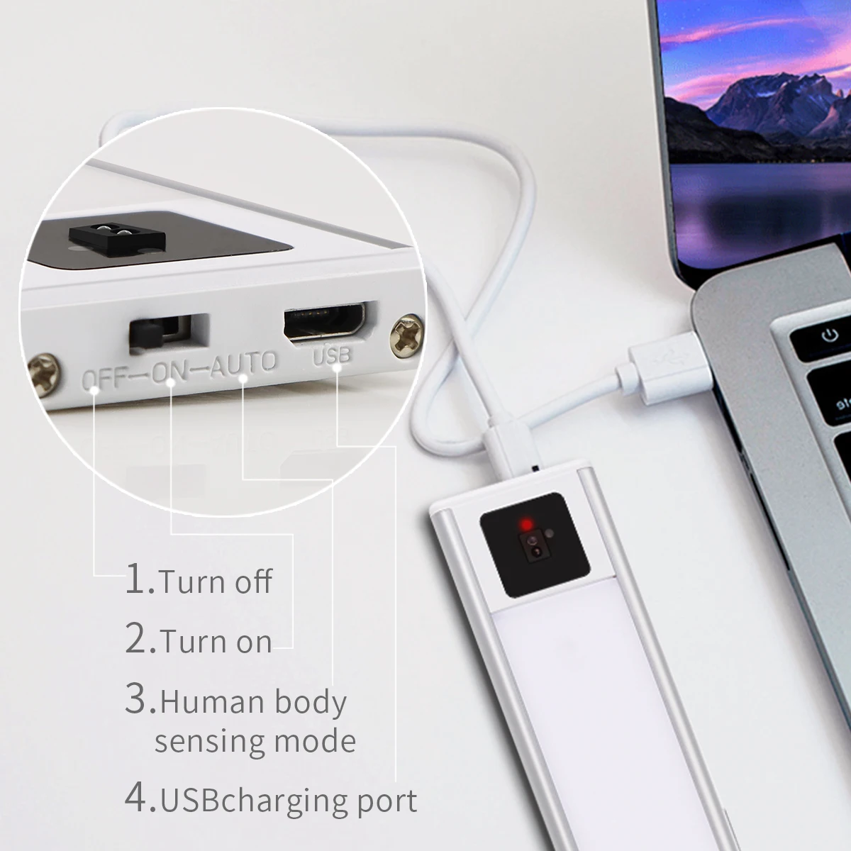 L’applique murale se charge via un câble USB.