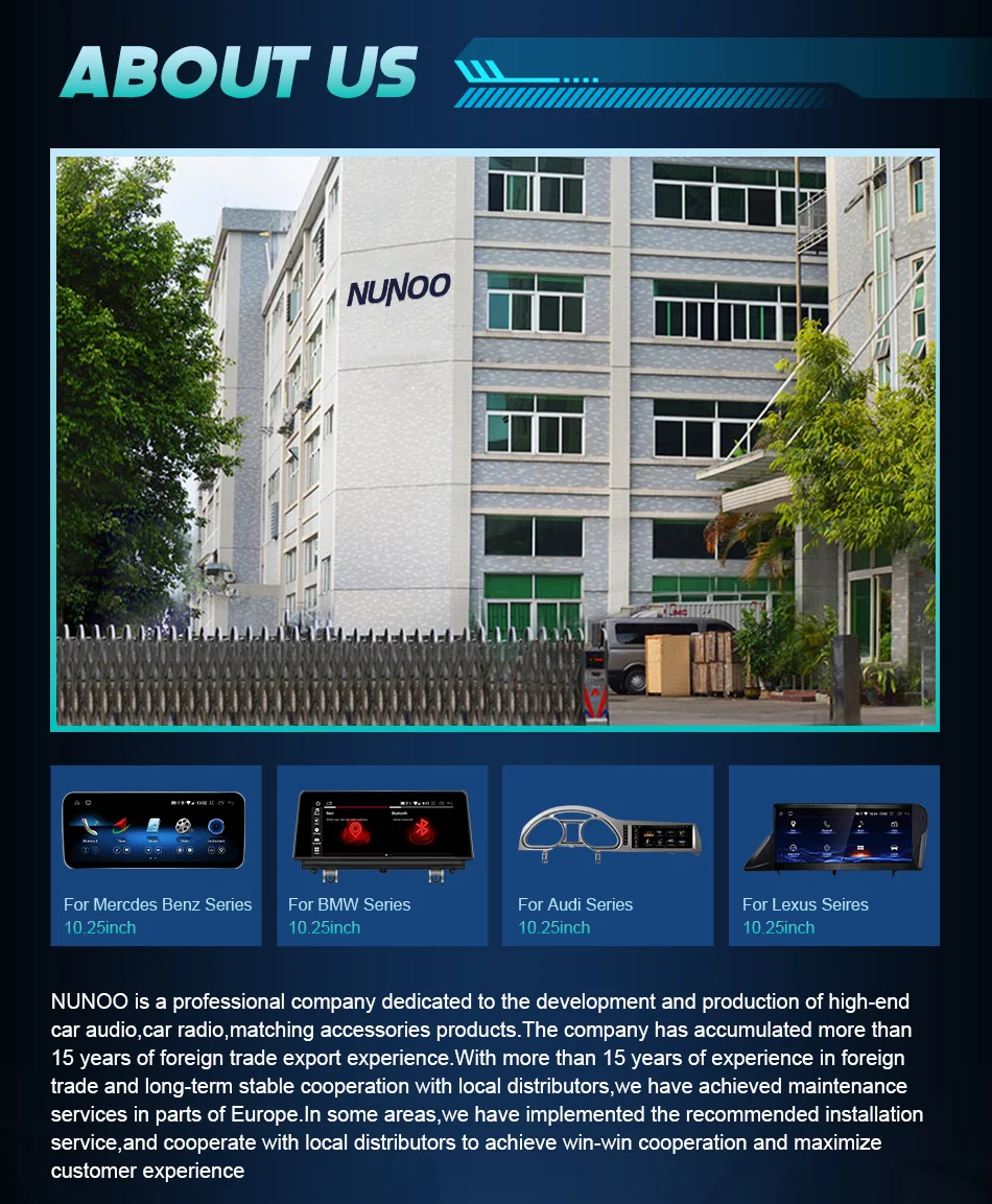 1. NUNOO est AliExpress meilleures marques, 15 ans de production et de vente professionnelle. Principalement vendre Pour Audi BMW BENZ LEXUS voiture multimédia, populaire parmi les clients. Notre objectif est de fournir le meilleur produit et service pour notre client, fournir également une mise à jour gratuite du micrologiciel