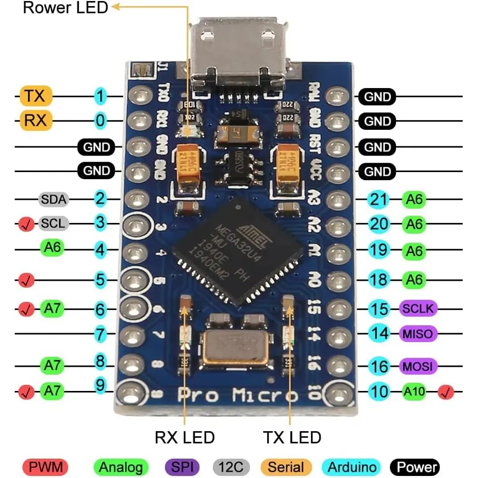 | Microcontrôleur ATmega32U4 | Le Pro Micro est similaire au Pro Mini sauf avec un ATmega32U4 à bord. L’émetteur-récepteur USB à l’intérieur du 32U4 nous permet d’ajouter une connectivité USB à bord et de supprimer l’interface USB externe encombrante. |